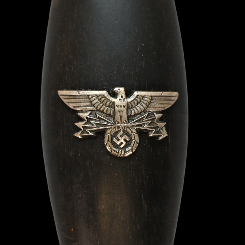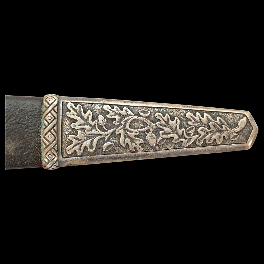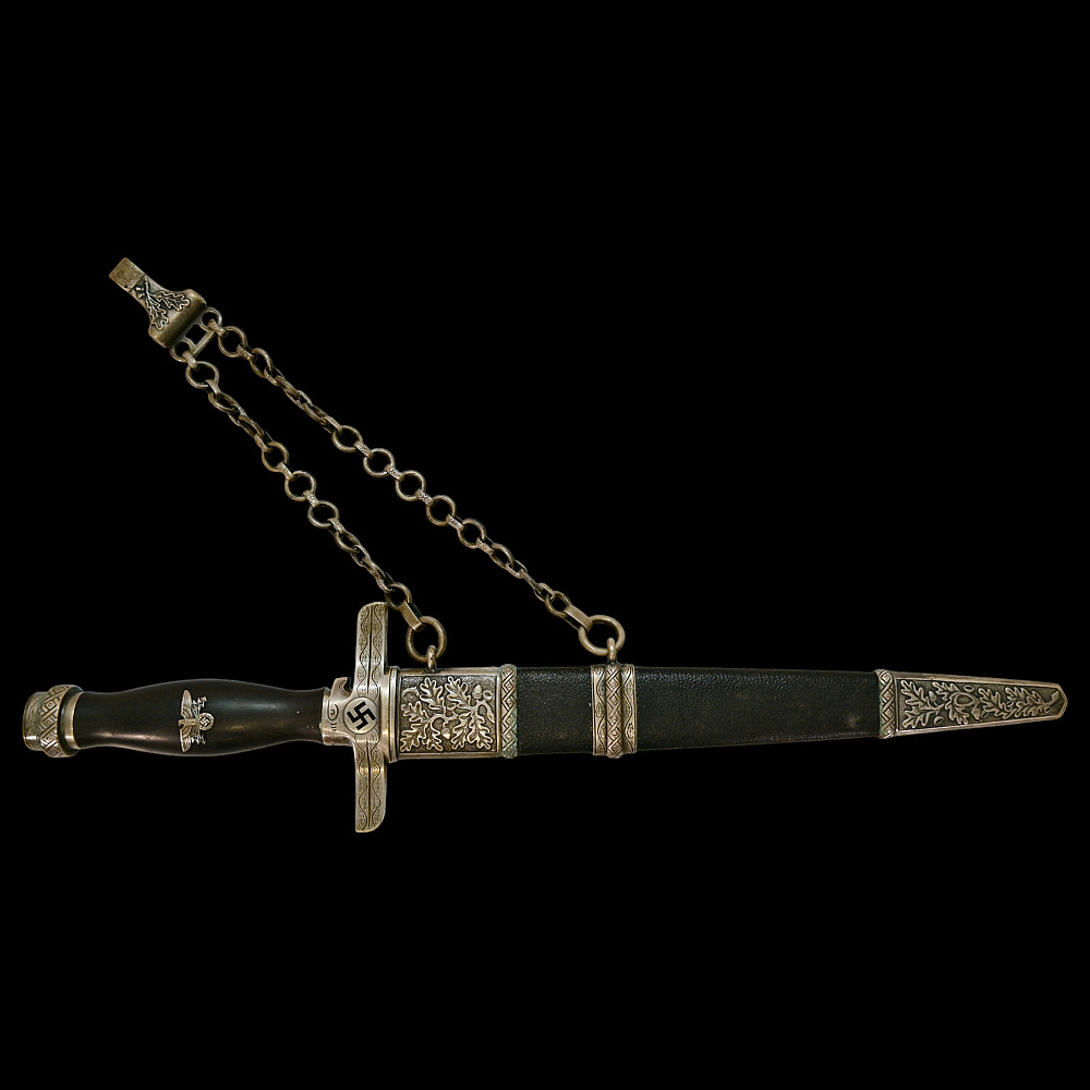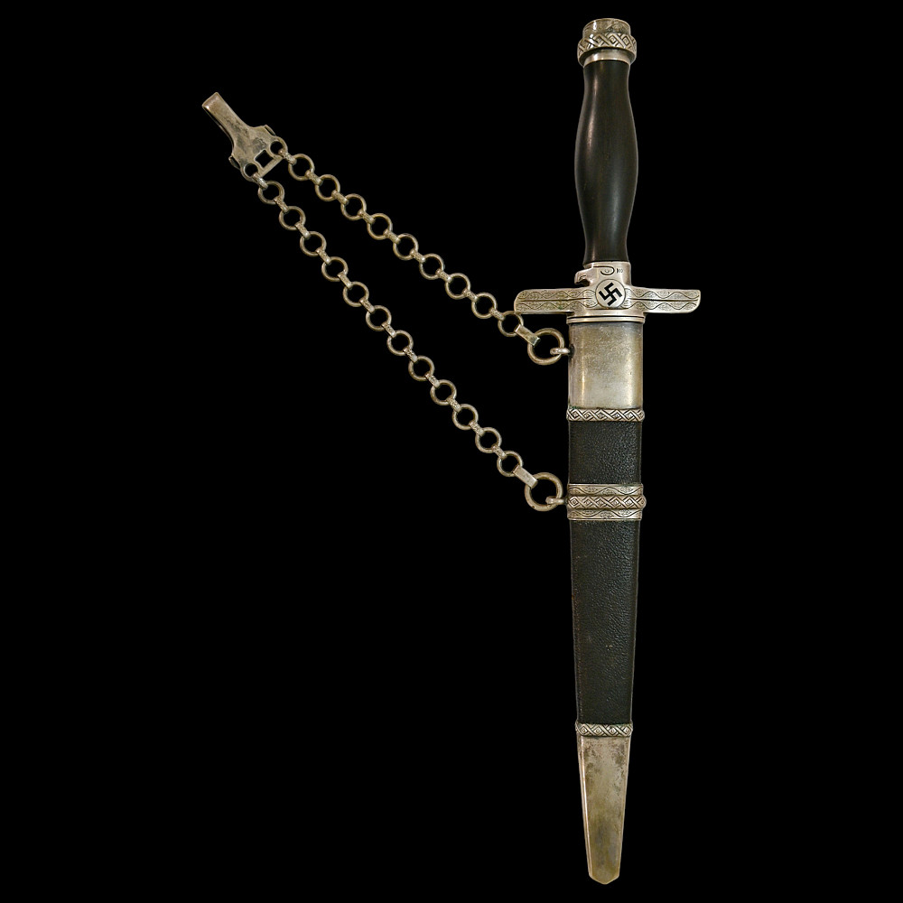 Third Reich Postschutz Officer's Award Dagger, model 1939. The Damascus blade is decorated with a gold inscription on both sides «Gewidmet vom Postschutz des Bez. Menstrein» and «Die Treue ist das Mark der Ehre" maker Paul Weyersberg. This model could not be identified in the literature. No guarantee of authenticity. Total length- 39,5cm.
