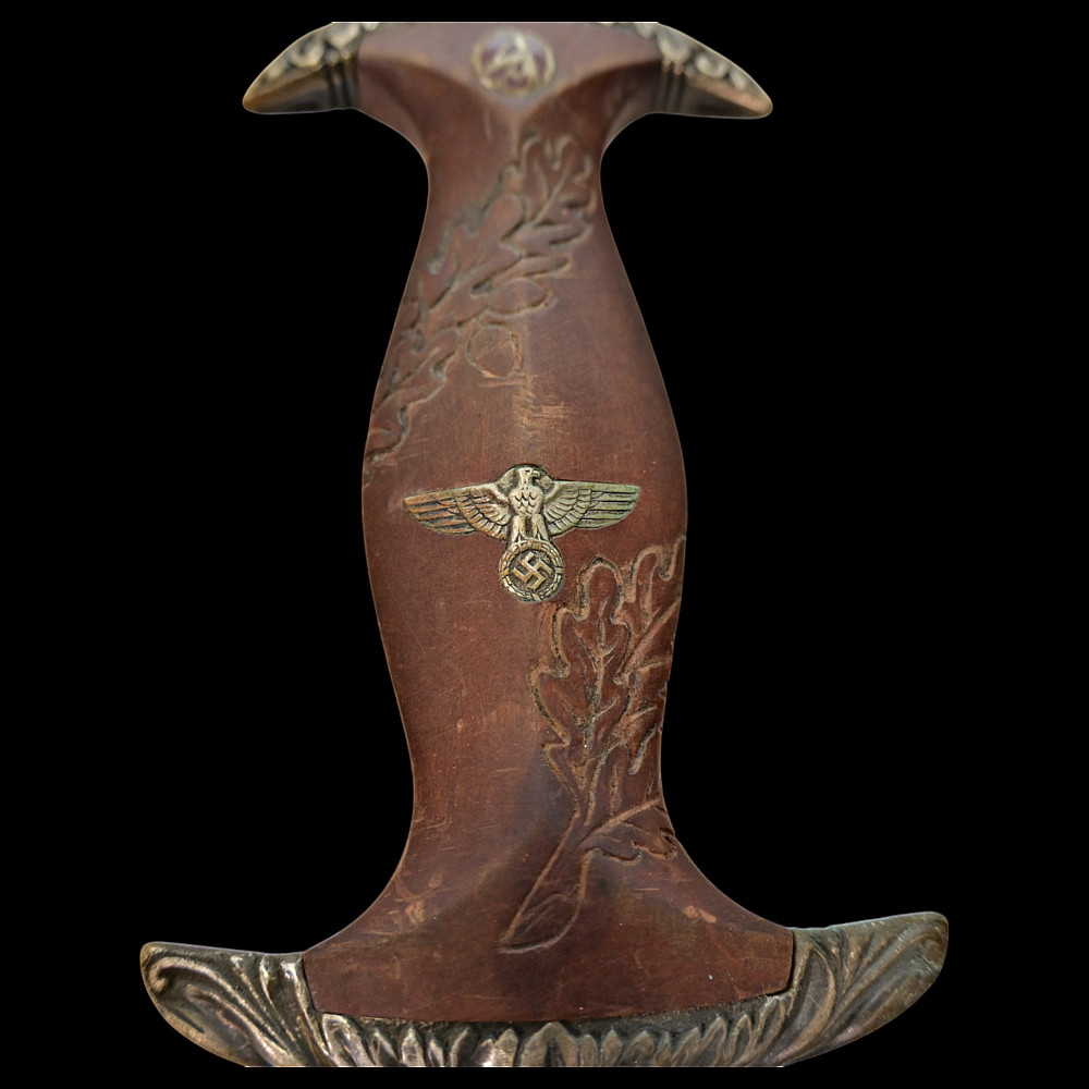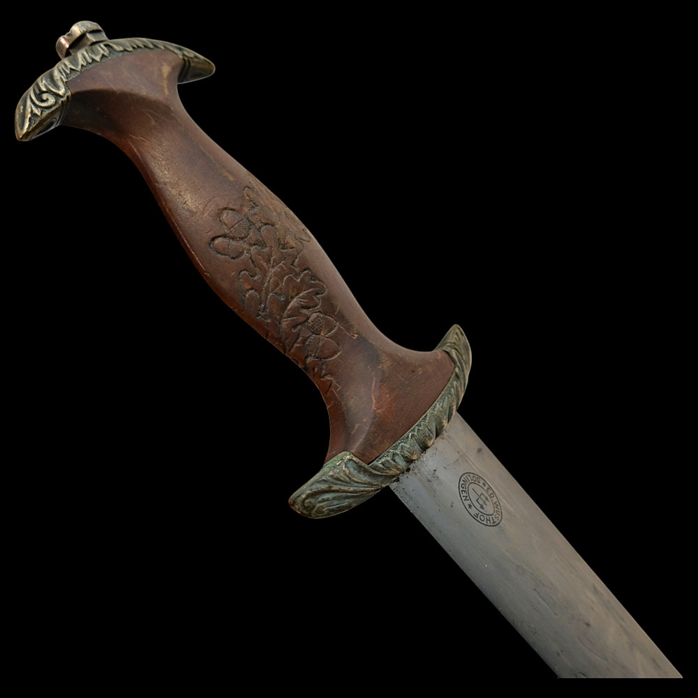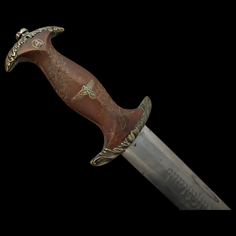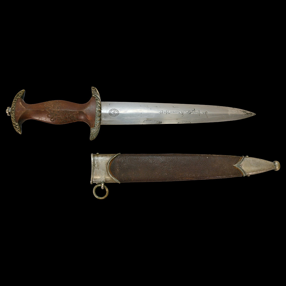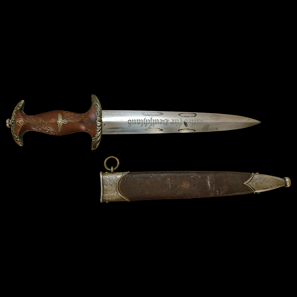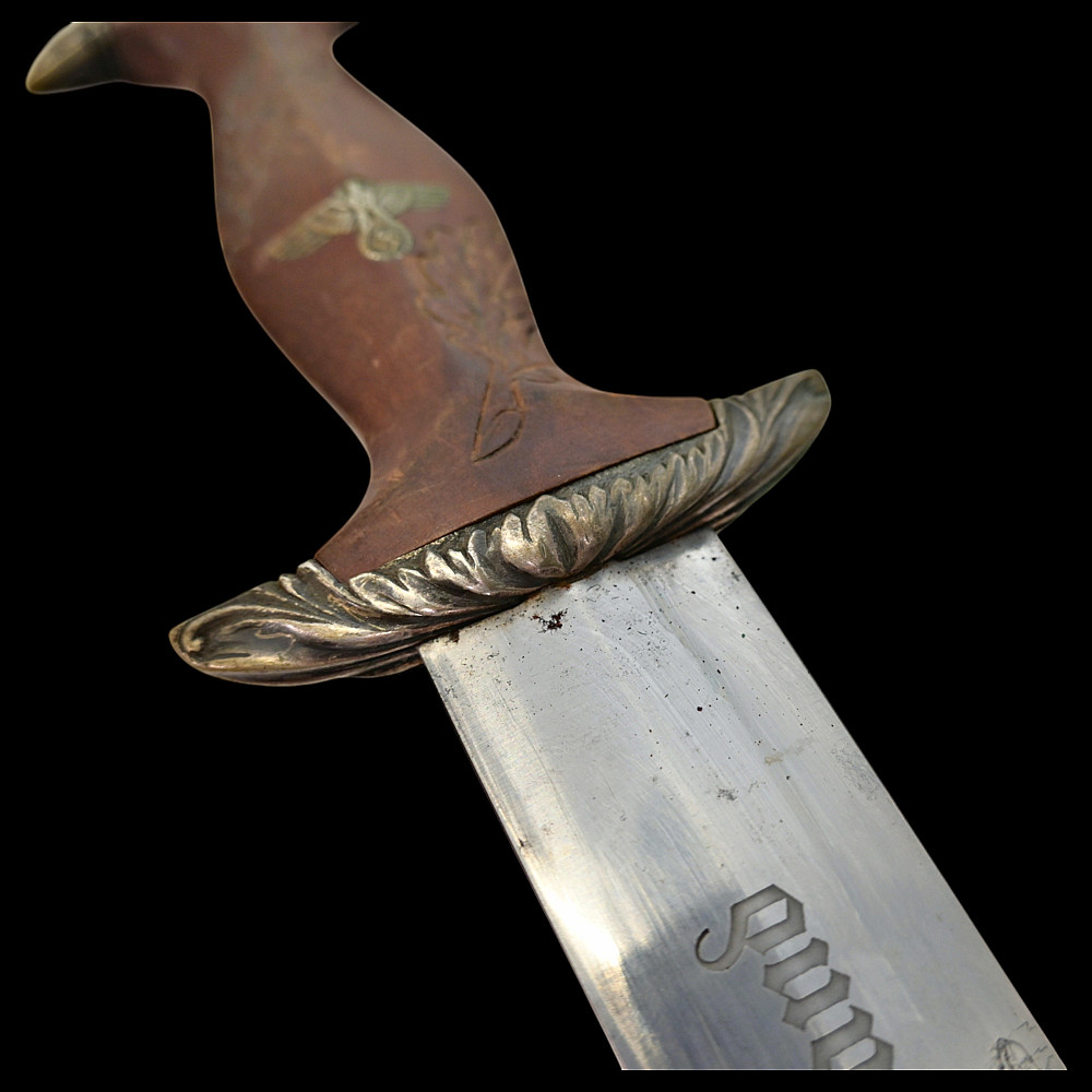 Third Reich SA Honor Dagger with Ernst Rohm Dedication - E D Wusthof, Solingen. The blade bears the etched dedication inscription: “In herzlicher Freundschaft Ernst Rohm” (“In Heartfelt Friendship, Ernst Röhm”). Approximately 135,860 such daggers were awarded before Rohm’s execution and the subsequent purge of the SA leadership in 1934, after which most examples were destroyed or altered. The blade, marked E.D. Wüsthof, Solingen, features the etched SA motto “Alles für Deutschland” on the obverse. The wooden grip is ornately carved with oak-leaf motifs, and inset with the SA enamel insignia and national eagle. The scabbard, covered in brown leather, with engraved nickel-silver fittings with fine oak-leaf and acorn detailing. Good condition. Authenticity not guaranteed. Total length: 38.4 cm.
