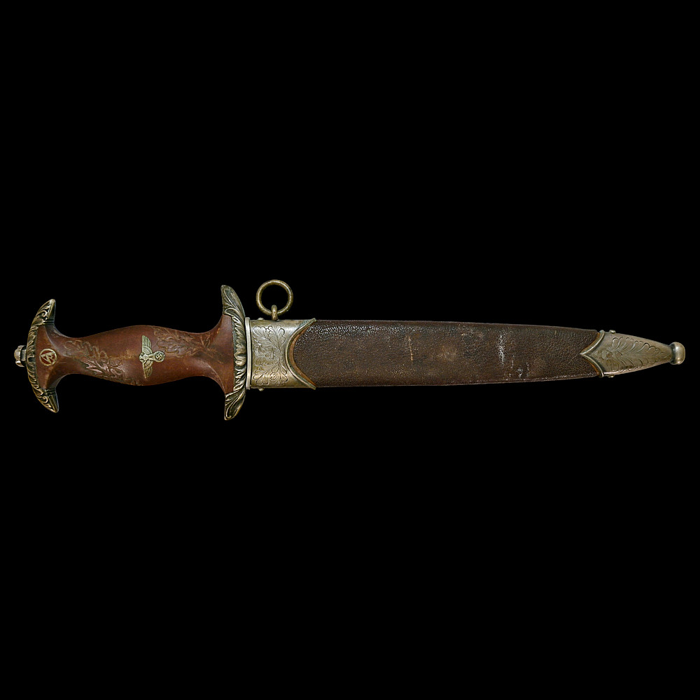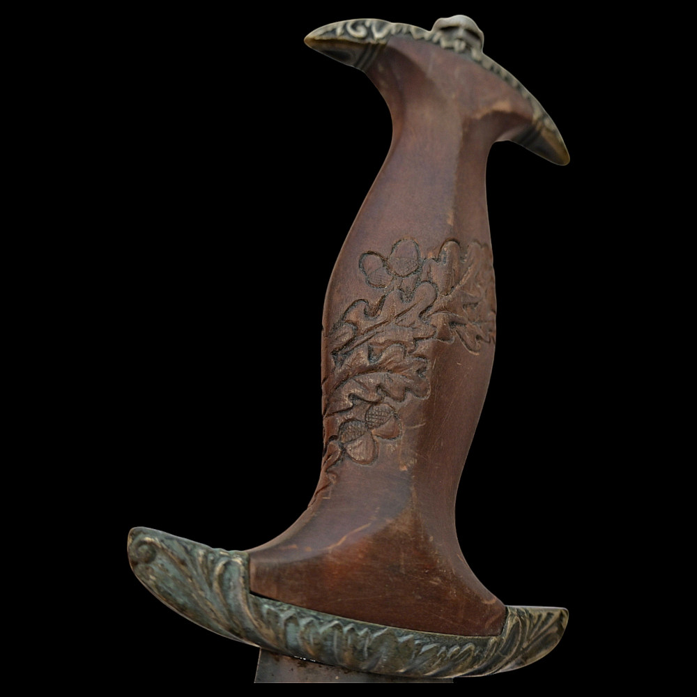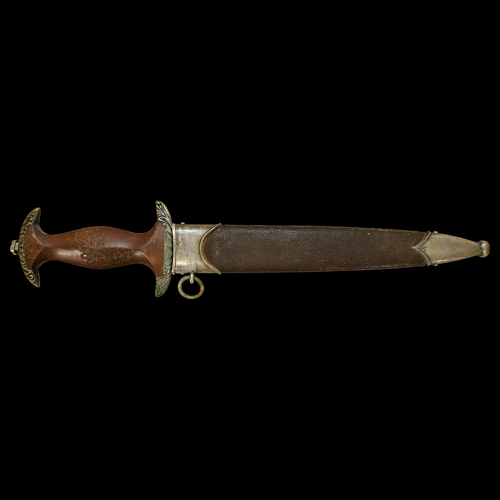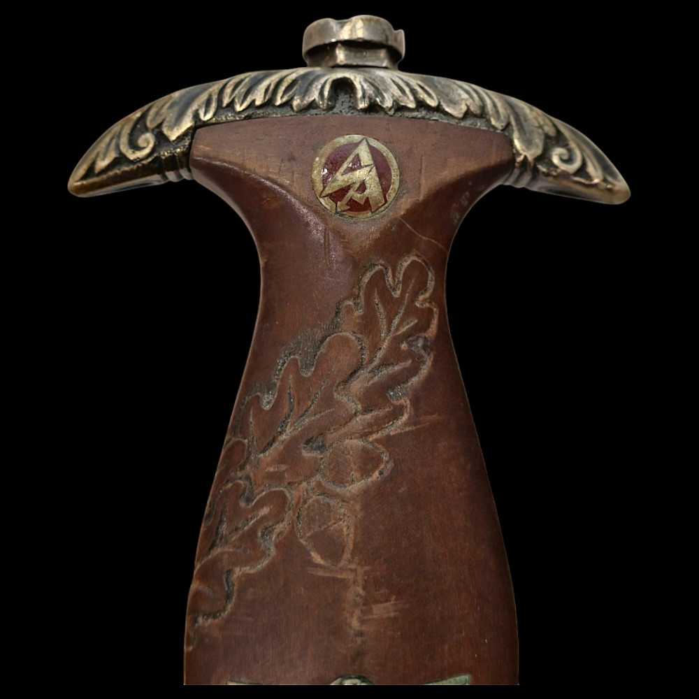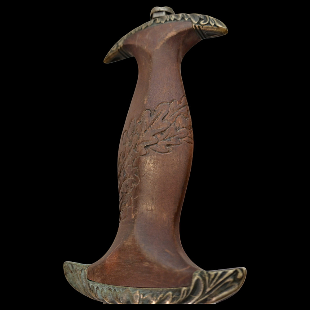 Third Reich SA Honor Dagger with Ernst Rohm Dedication - E D Wusthof, Solingen. The blade bears the etched dedication inscription: “In herzlicher Freundschaft Ernst Rohm” (“In Heartfelt Friendship, Ernst Röhm”). Approximately 135,860 such daggers were awarded before Rohm’s execution and the subsequent purge of the SA leadership in 1934, after which most examples were destroyed or altered. The blade, marked E.D. Wüsthof, Solingen, features the etched SA motto “Alles für Deutschland” on the obverse. The wooden grip is ornately carved with oak-leaf motifs, and inset with the SA enamel insignia and national eagle. The scabbard, covered in brown leather, with engraved nickel-silver fittings with fine oak-leaf and acorn detailing. Good condition. Authenticity not guaranteed. Total length: 38.4 cm.