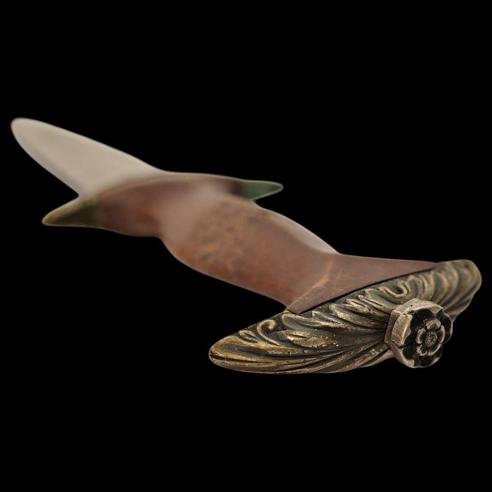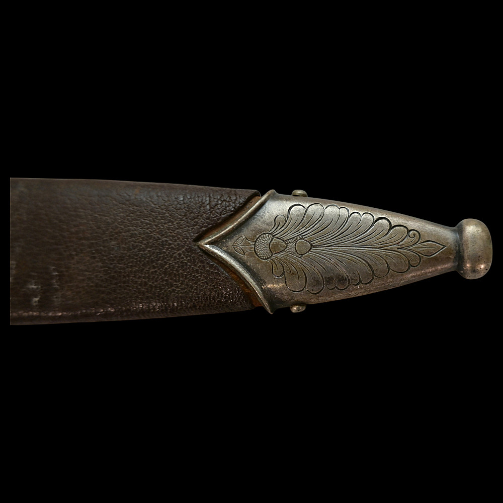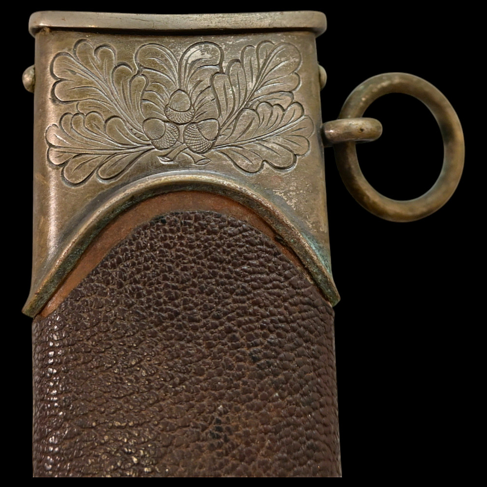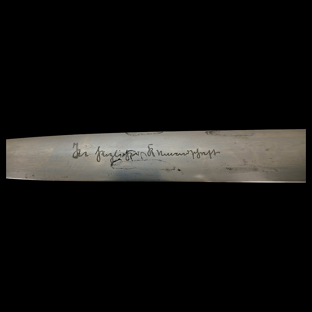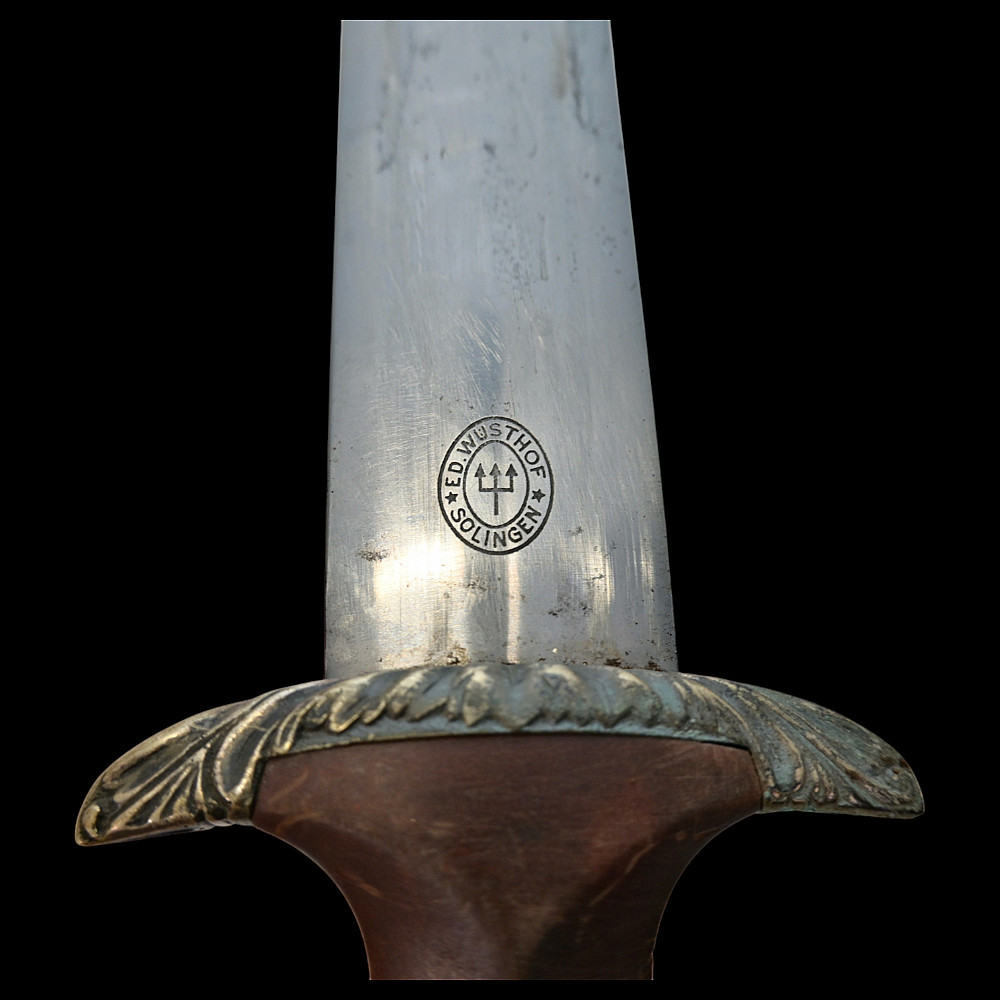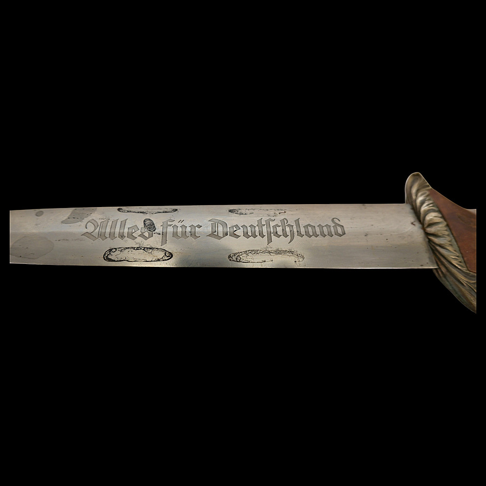 Third Reich SA Honor Dagger with Ernst Rohm Dedication - E D Wusthof, Solingen. The blade bears the etched dedication inscription: “In herzlicher Freundschaft Ernst Rohm” (“In Heartfelt Friendship, Ernst Röhm”). Approximately 135,860 such daggers were awarded before Rohm’s execution and the subsequent purge of the SA leadership in 1934, after which most examples were destroyed or altered. The blade, marked E.D. Wüsthof, Solingen, features the etched SA motto “Alles für Deutschland” on the obverse. The wooden grip is ornately carved with oak-leaf motifs, and inset with the SA enamel insignia and national eagle. The scabbard, covered in brown leather, with engraved nickel-silver fittings with fine oak-leaf and acorn detailing. Good condition. Authenticity not guaranteed. Total length: 38.4 cm.