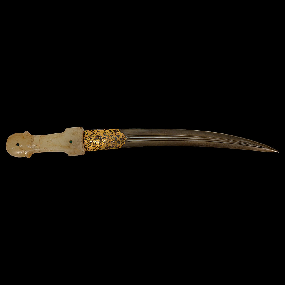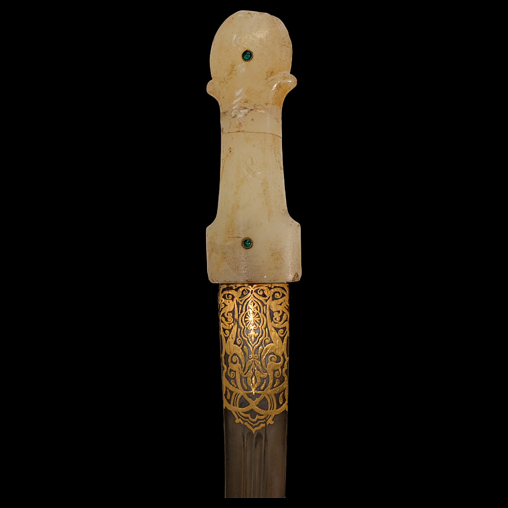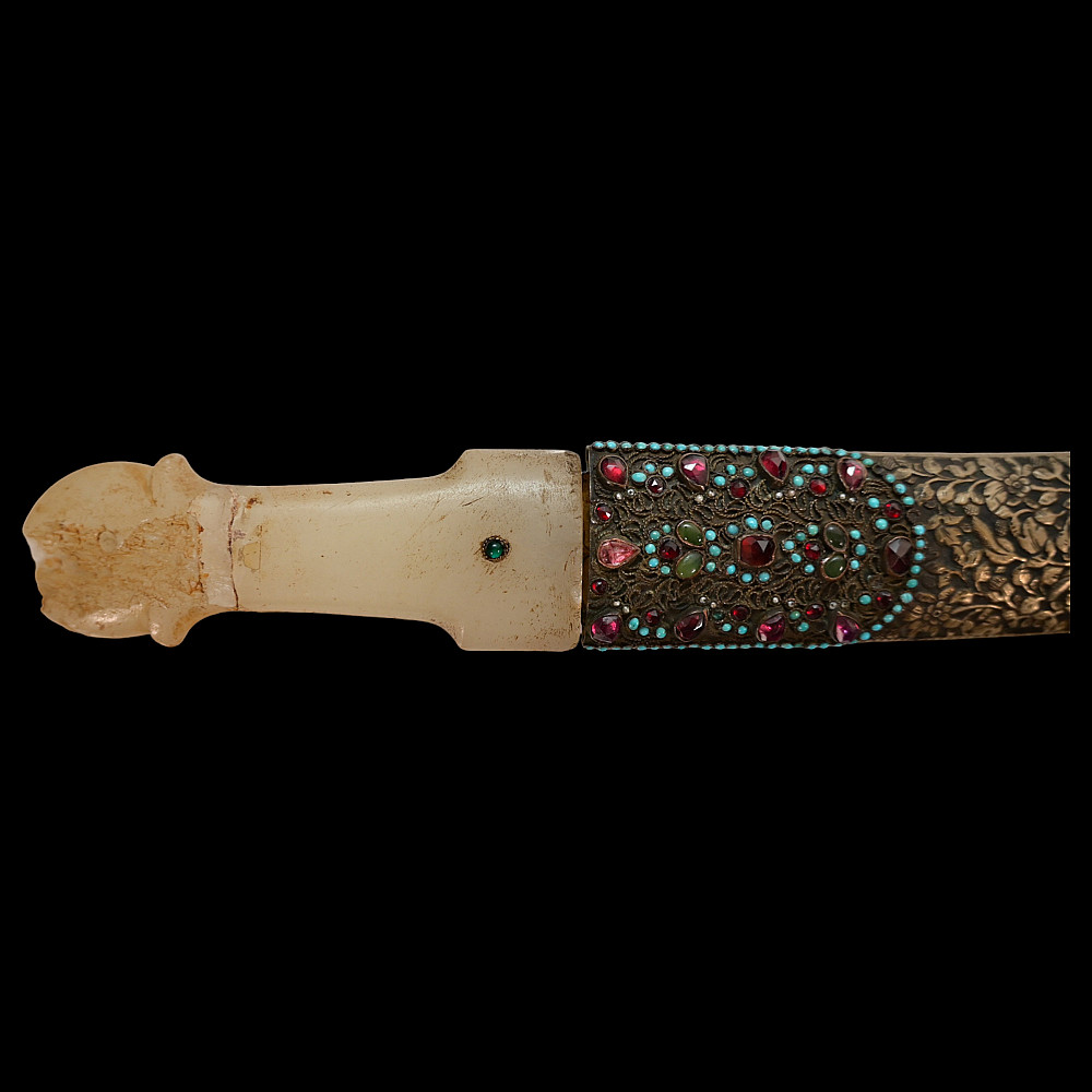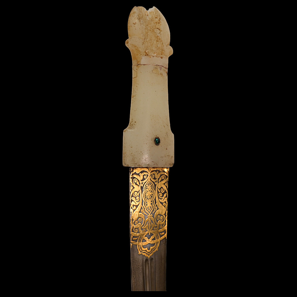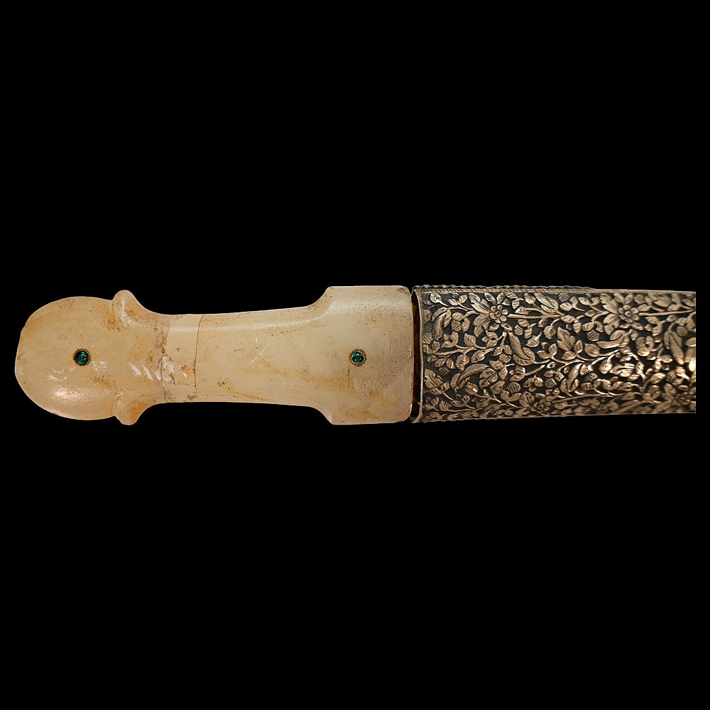 Very rare Dagger with jade handle, Wootz steel blade and decorated with precious stones and gold, Ottoman Empire, 18th century. Curved wootz blade with two fullers on each side. Gold inlay at the base of the blade. The jade handle is decorated with emeralds on both sides. Very high quality and ornate scabbard made of hammered silver. The upper part of the knife is magnificently decorated with filigree and precious stones. This very rare dagger was probably made in Turkey, in Istanbul, during the time of Sultan Abdulhamid I (1774-89). Length 43 cm.