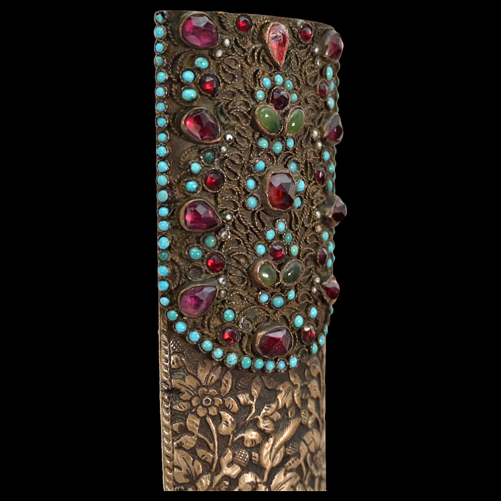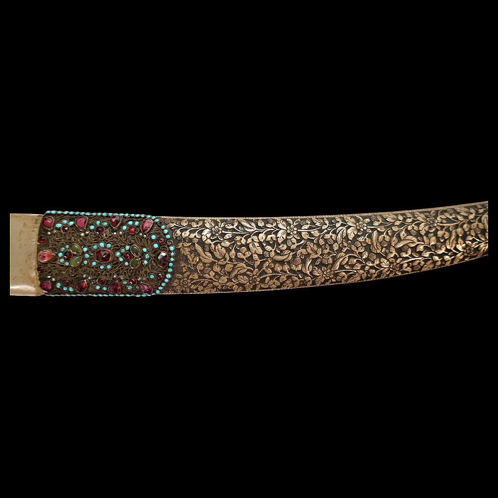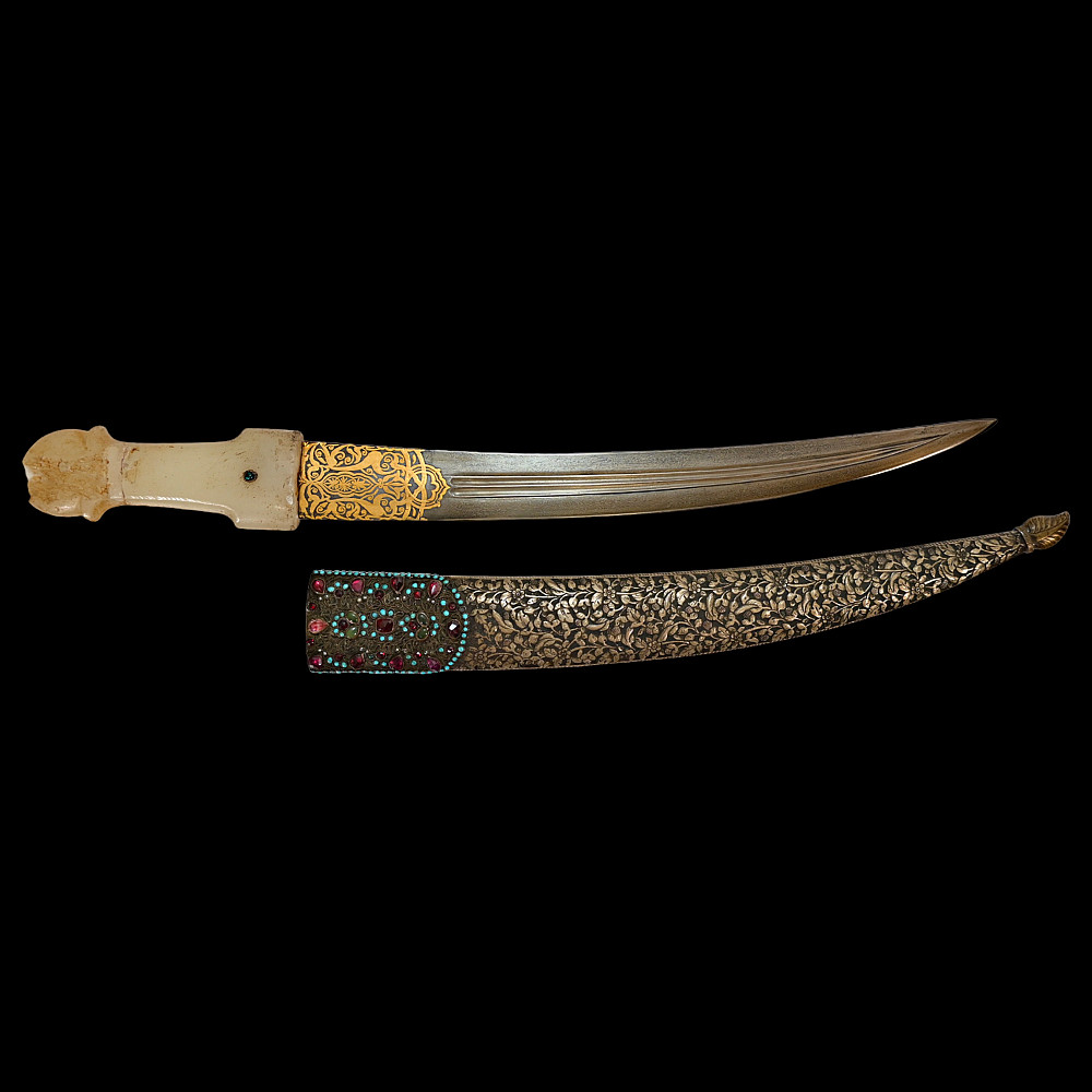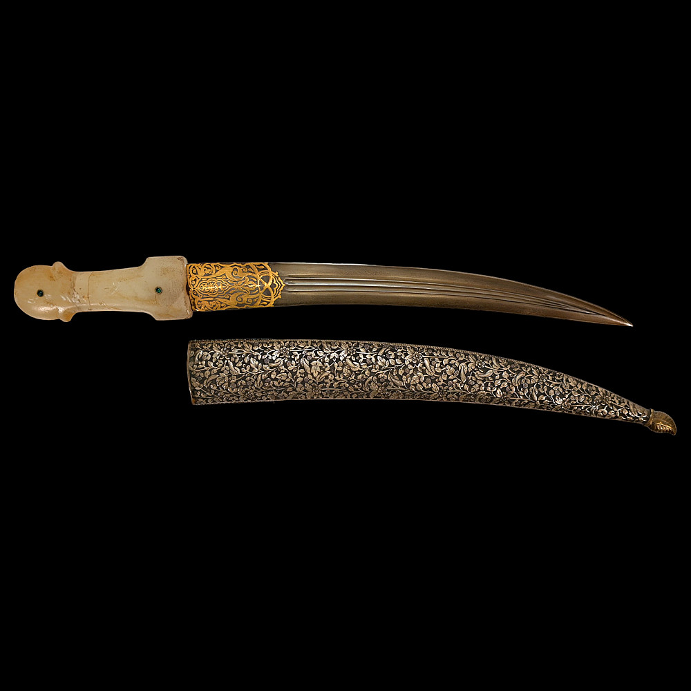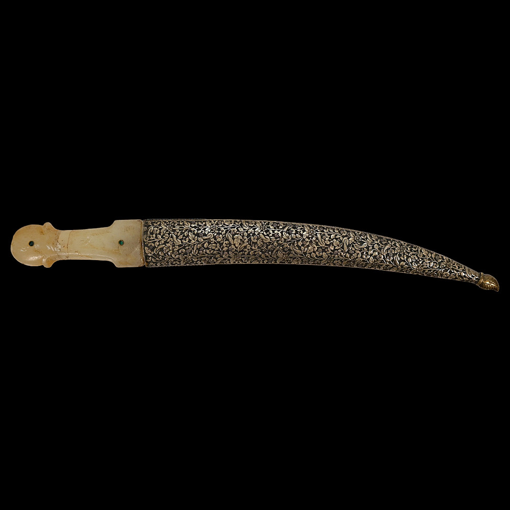 Very rare Dagger with jade handle, Wootz steel blade and decorated with precious stones and gold, Ottoman Empire, 18th century. Curved wootz blade with two fullers on each side. Gold inlay at the base of the blade. The jade handle is decorated with emeralds on both sides. Very high quality and ornate scabbard made of hammered silver. The upper part of the knife is magnificently decorated with filigree and precious stones. This very rare dagger was probably made in Turkey, in Istanbul, during the time of Sultan Abdulhamid I (1774-89). Length 43 cm.