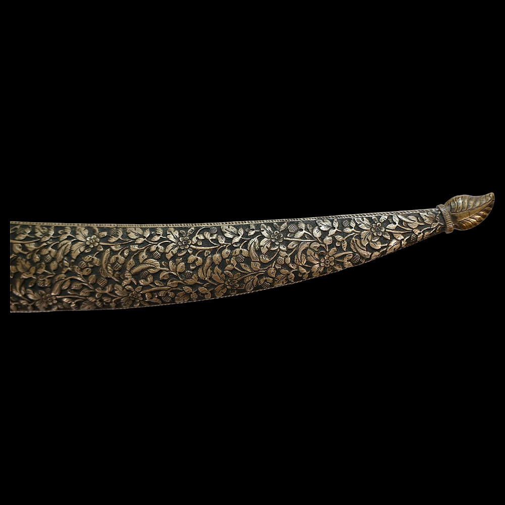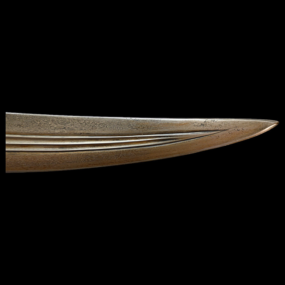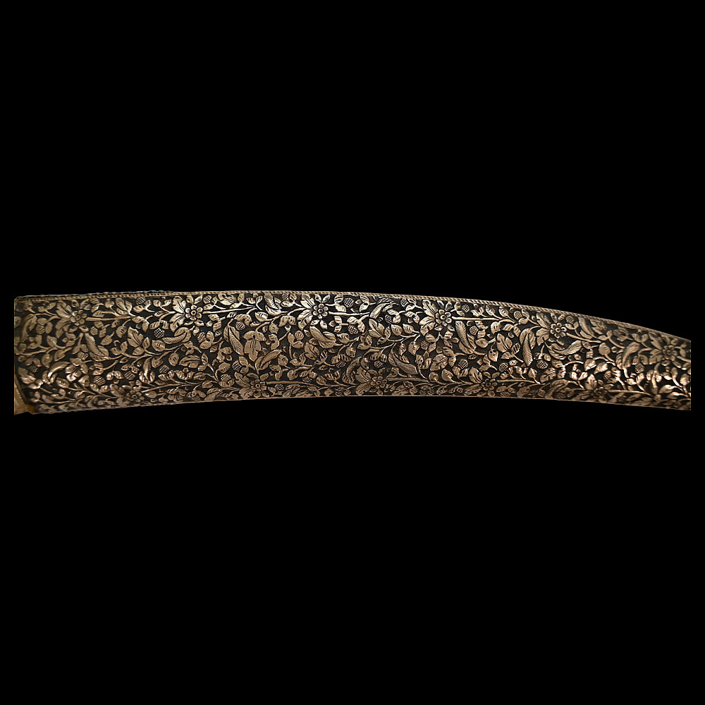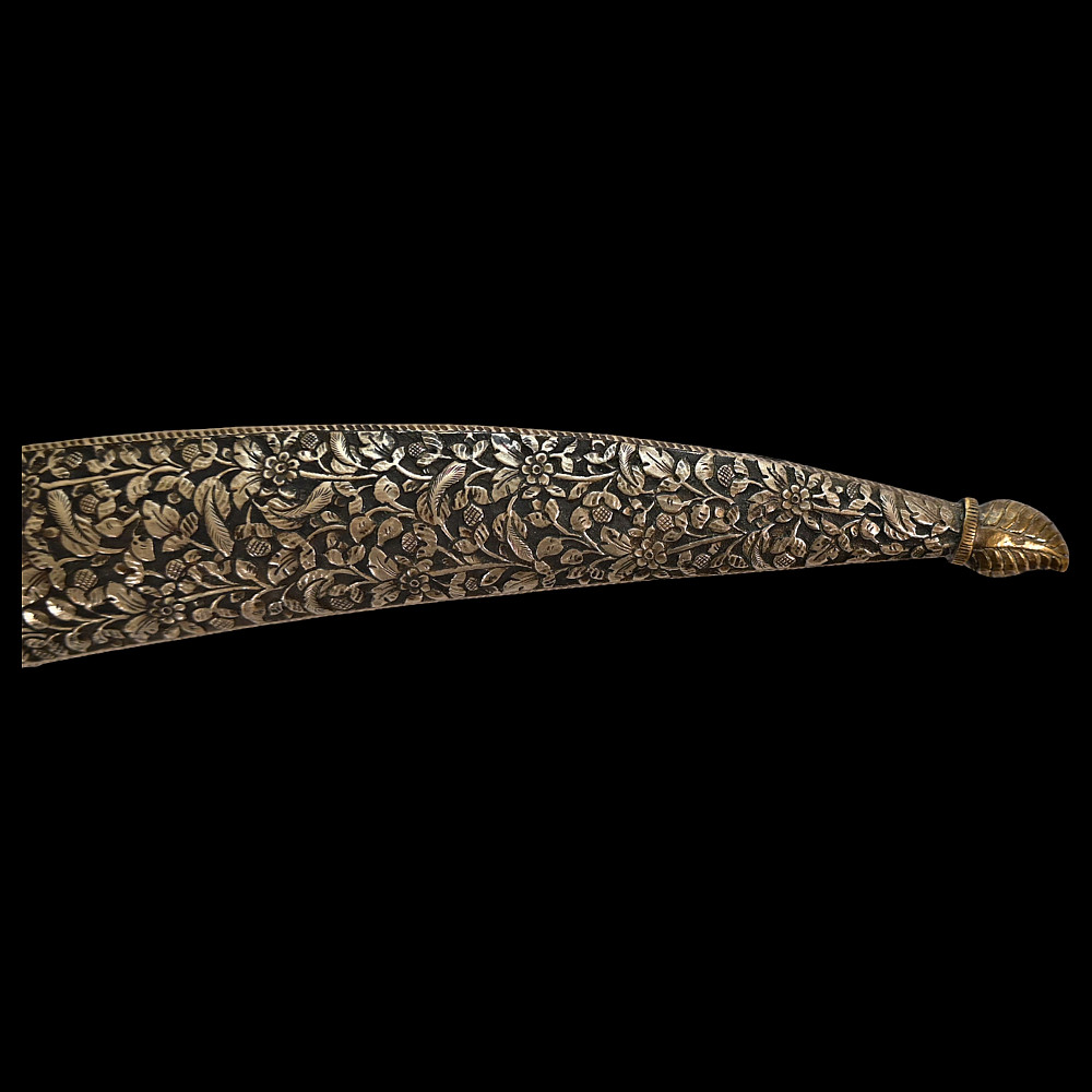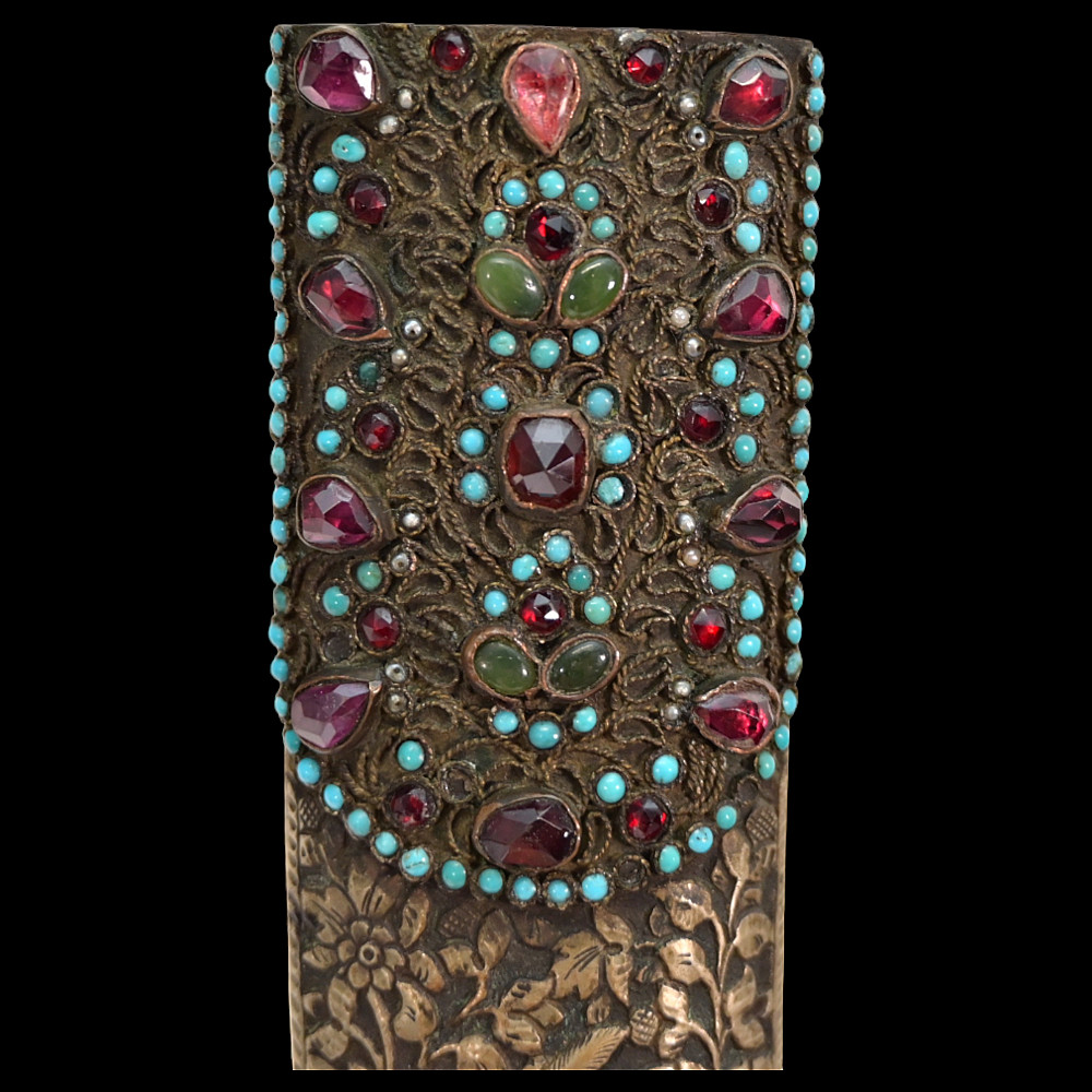 Very rare Dagger with jade handle, Wootz steel blade and decorated with precious stones and gold, Ottoman Empire, 18th century. Curved wootz blade with two fullers on each side. Gold inlay at the base of the blade. The jade handle is decorated with emeralds on both sides. Very high quality and ornate scabbard made of hammered silver. The upper part of the knife is magnificently decorated with filigree and precious stones. This very rare dagger was probably made in Turkey, in Istanbul, during the time of Sultan Abdulhamid I (1774-89). Length 43 cm.