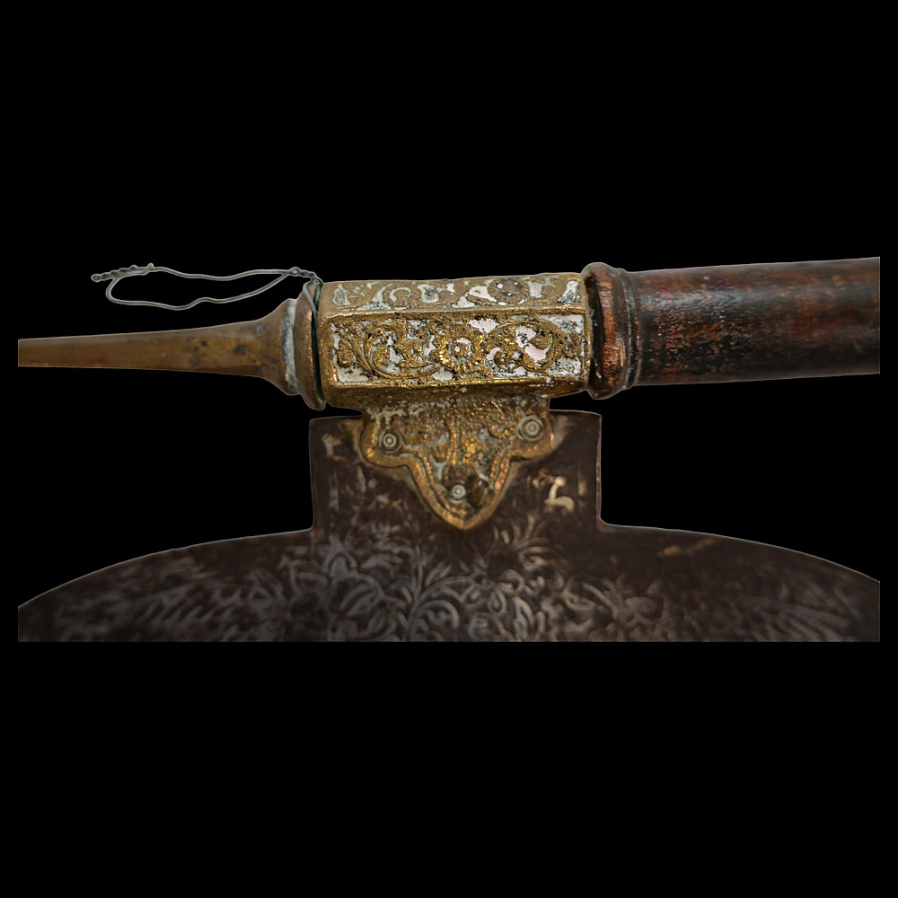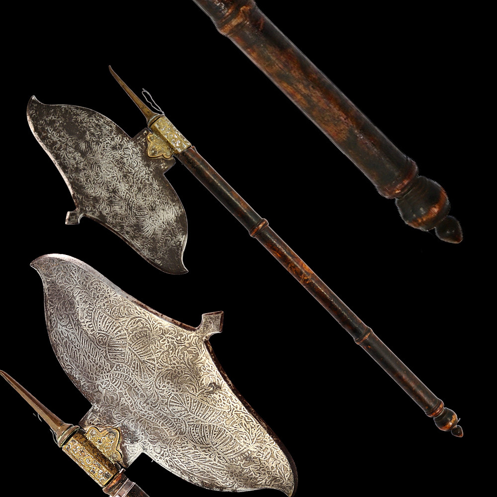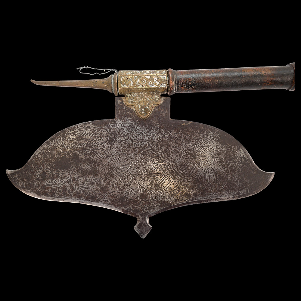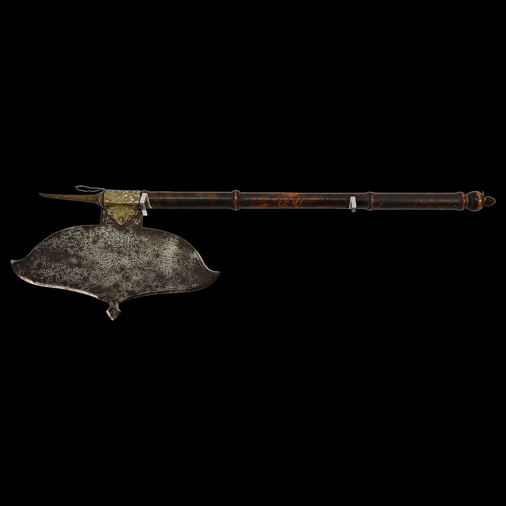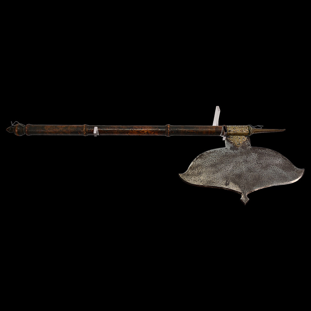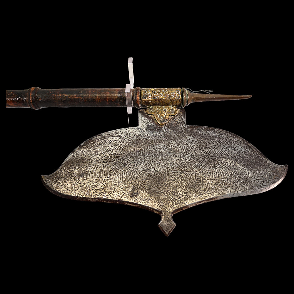 Very Rare Indian Battle Ax with decorated blade, 19th century. The wooden figured shaft ends with a sharp bronze spike. The wide, steel blade is decorated with engraved floral decoration and is secured to the shaft with a decorated bronze base. A very rare and collectible item.