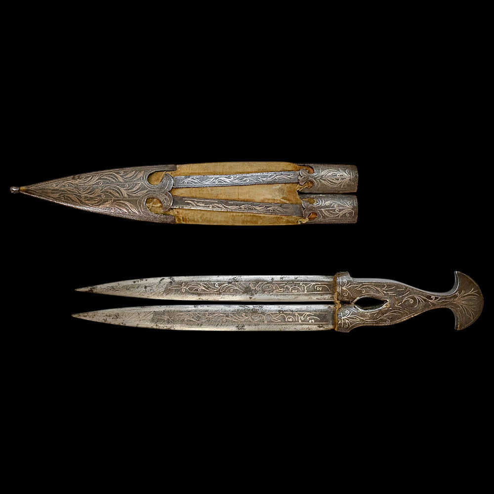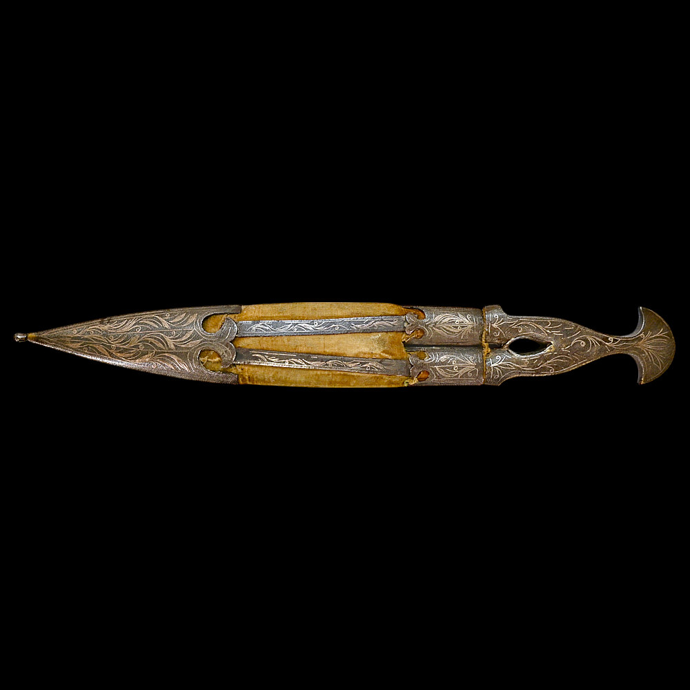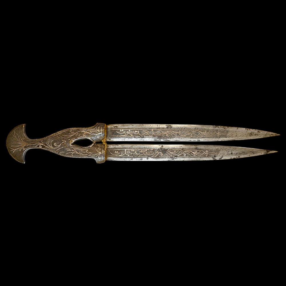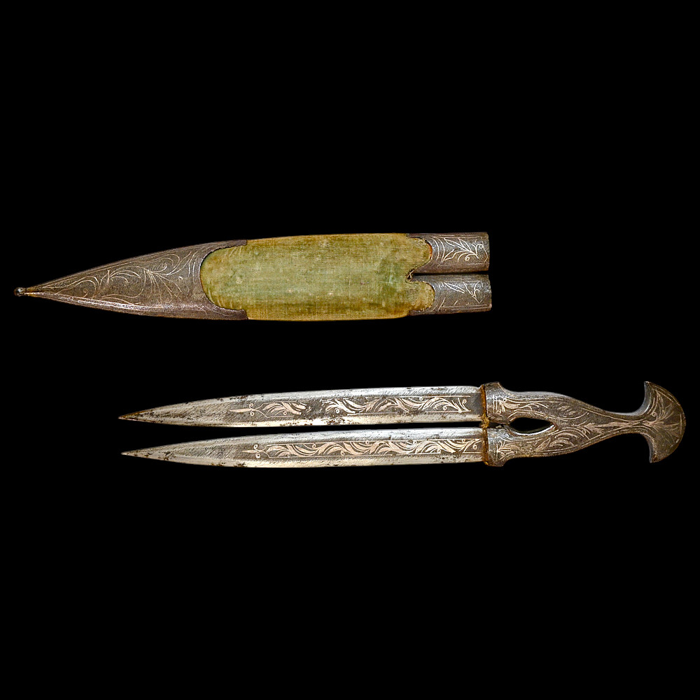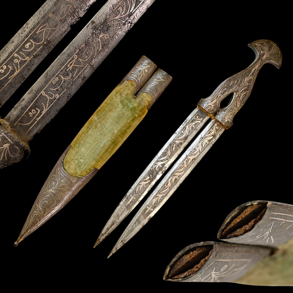 Very Rare Muslim Zulfiqar-Style Dagger with Silver Kofgari Inscriptions, Ottoman Empire, Syria, 19th Century. A highly unusual and collectible 19th-century Muslim dagger inspired by the legendary Zulfiqar sword, characterized by its distinctive bifurcated blade. This Syrian piece features a robust double-edged blade elegantly divided into two points, richly decorated with silver kofgari inlay depicting intricate floral motifs and religious inscriptions in Arabic script. The scabbard is of velvet-covered wood with silver-decorated fittings, echoing the blade’s ornamental design. Such daggers served as ceremonial or devotional objects—often representing divine justice and spiritual strength in Muslim tradition. A quality piece, exceedingly rare on the market, combining historical reverence with craftsmanship. Good condition. Size 29 cm.