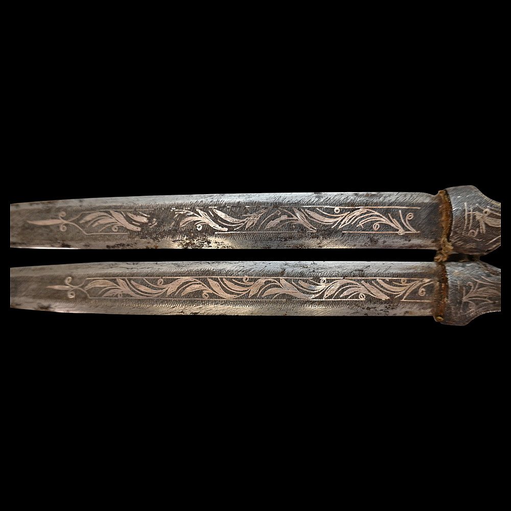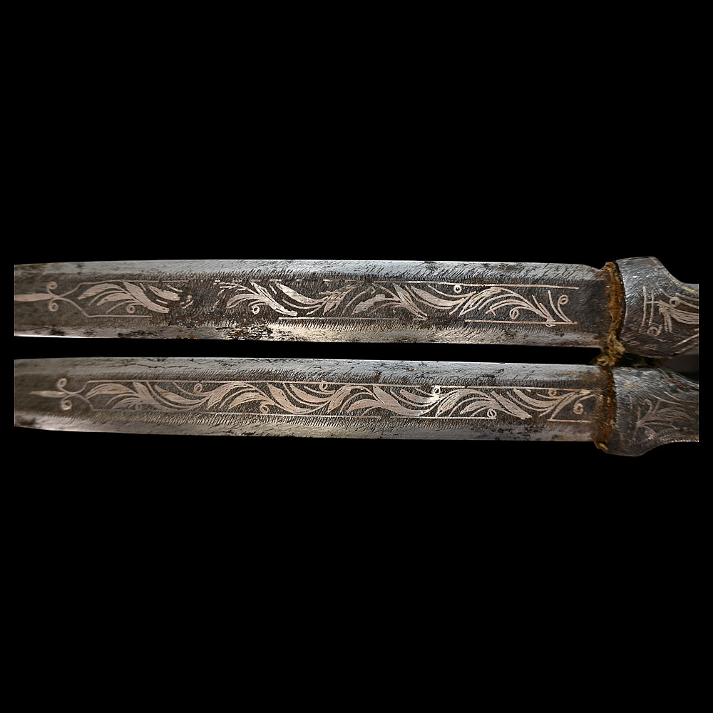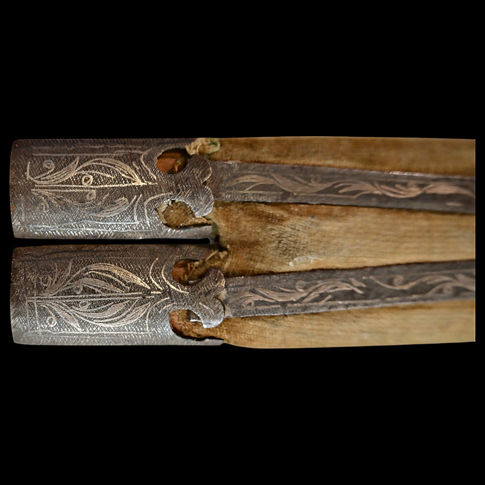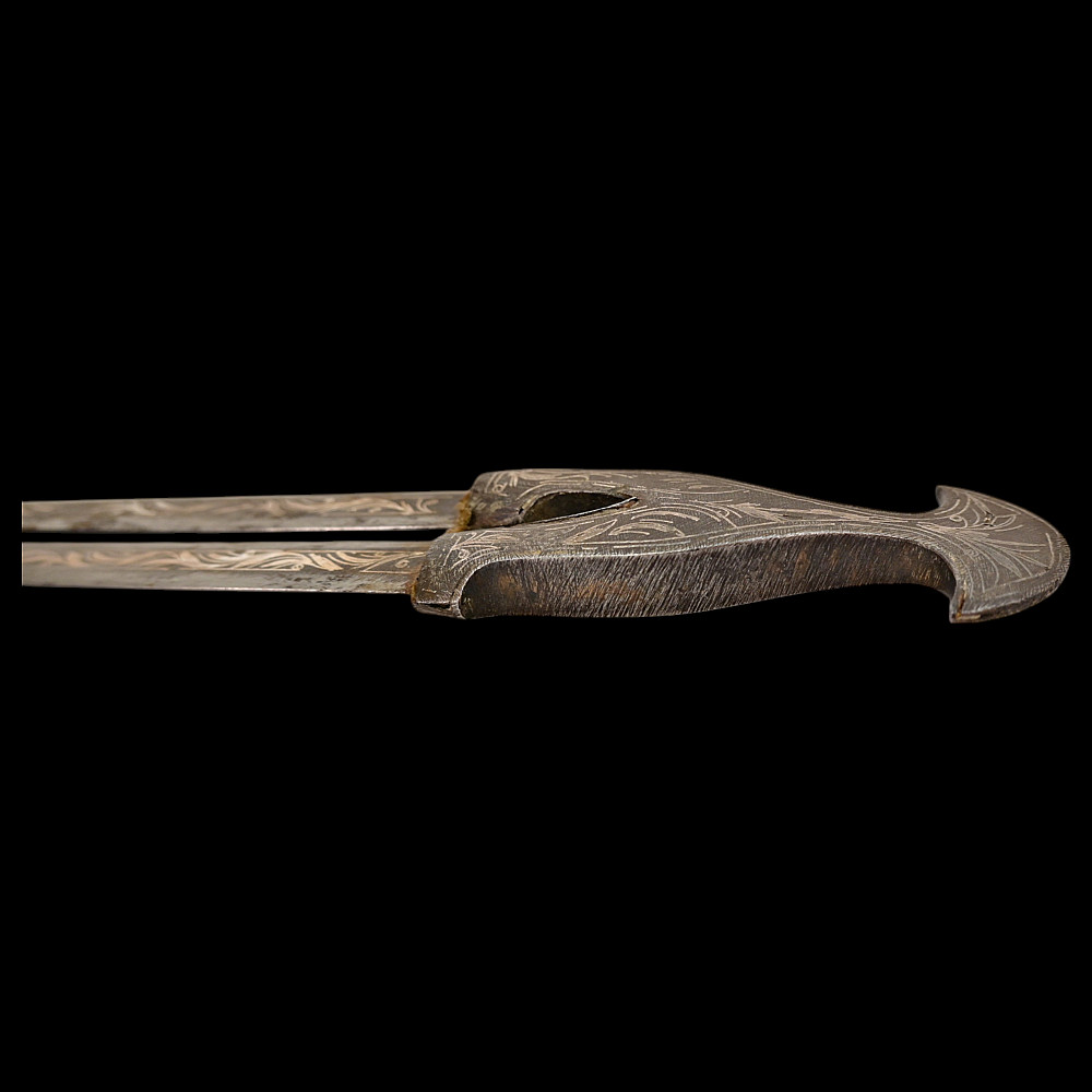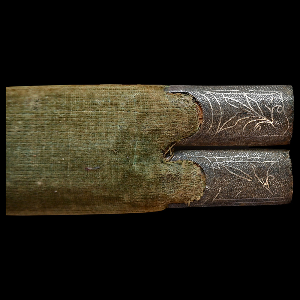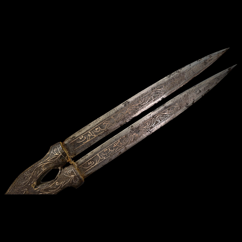 Very Rare Muslim Zulfiqar-Style Dagger with Silver Kofgari Inscriptions, Ottoman Empire, Syria, 19th Century. A highly unusual and collectible 19th-century Muslim dagger inspired by the legendary Zulfiqar sword, characterized by its distinctive bifurcated blade. This Syrian piece features a robust double-edged blade elegantly divided into two points, richly decorated with silver kofgari inlay depicting intricate floral motifs and religious inscriptions in Arabic script. The scabbard is of velvet-covered wood with silver-decorated fittings, echoing the blade’s ornamental design. Such daggers served as ceremonial or devotional objects—often representing divine justice and spiritual strength in Muslim tradition. A quality piece, exceedingly rare on the market, combining historical reverence with craftsmanship. Good condition. Size 29 cm.