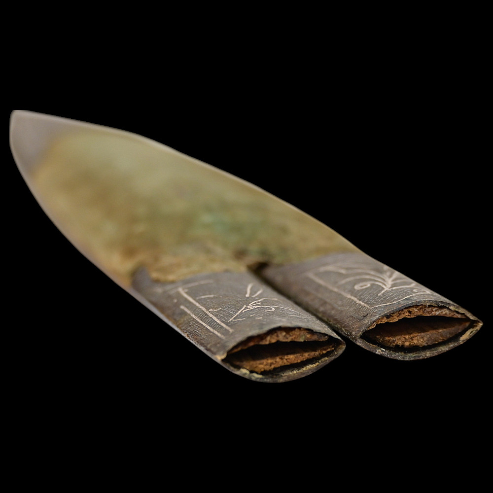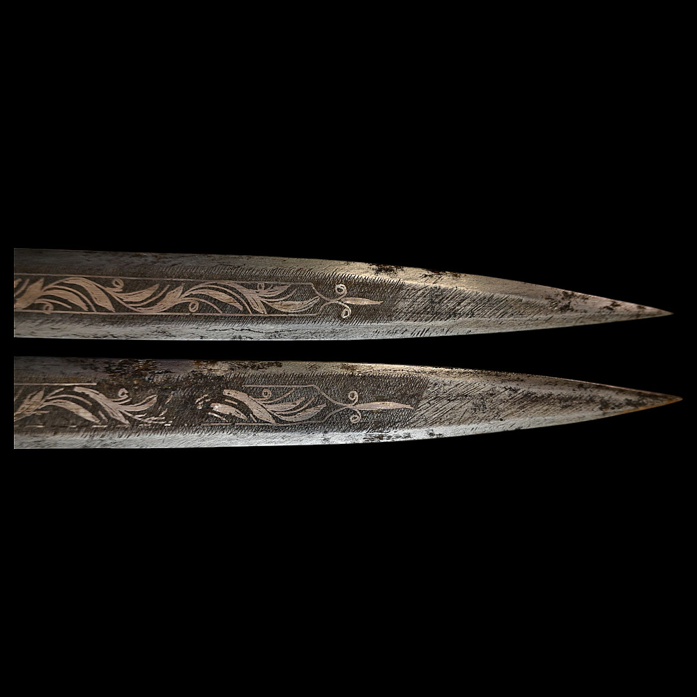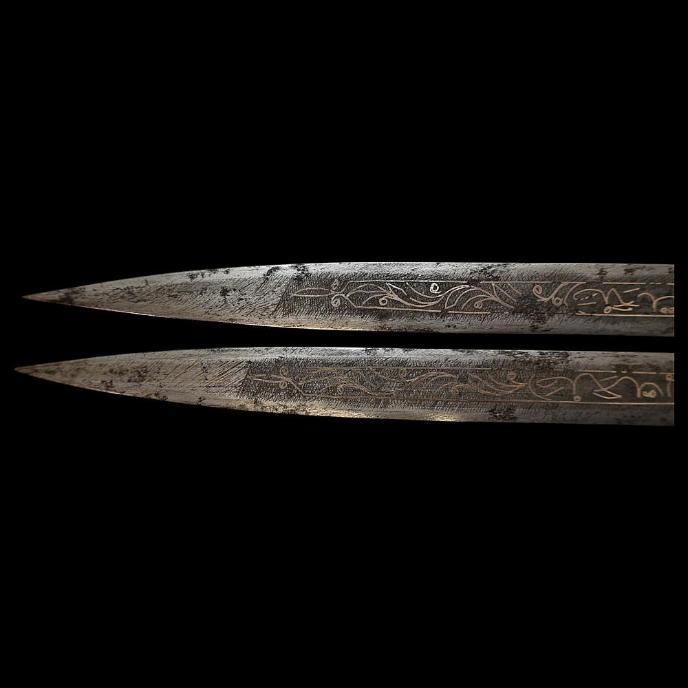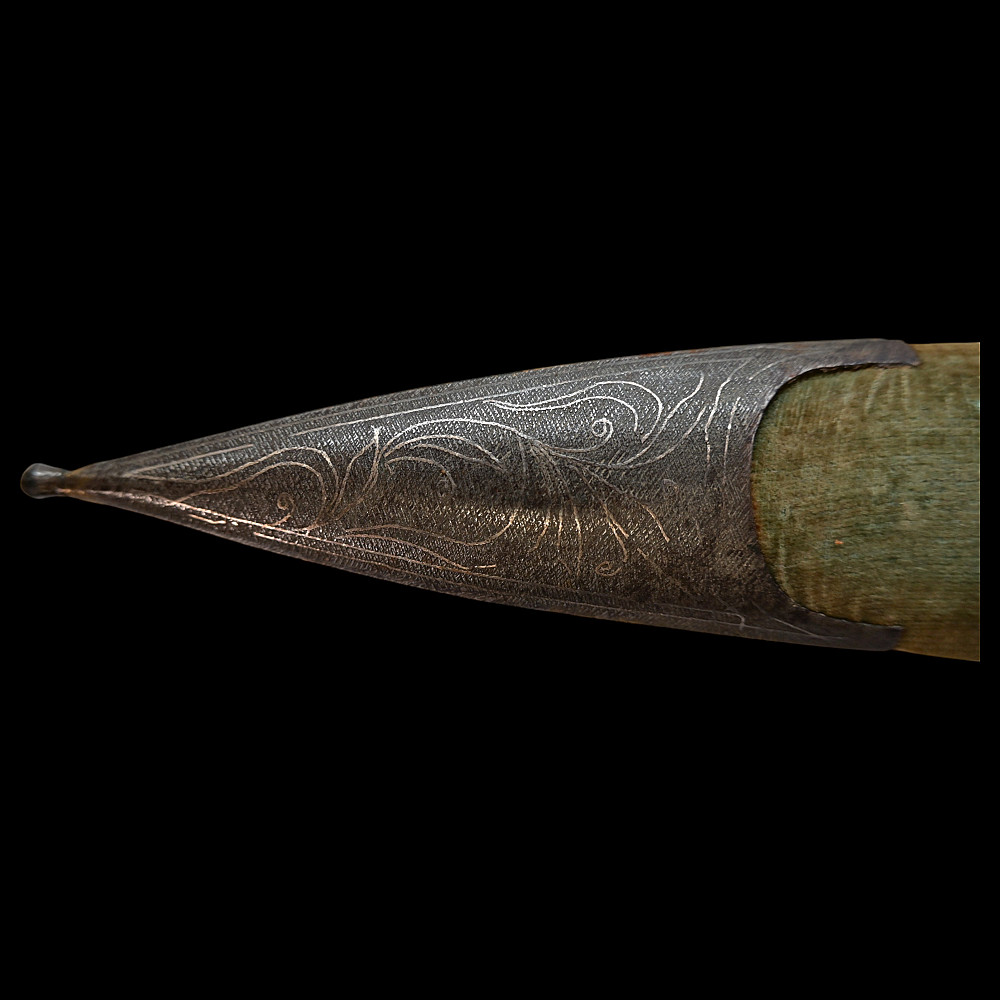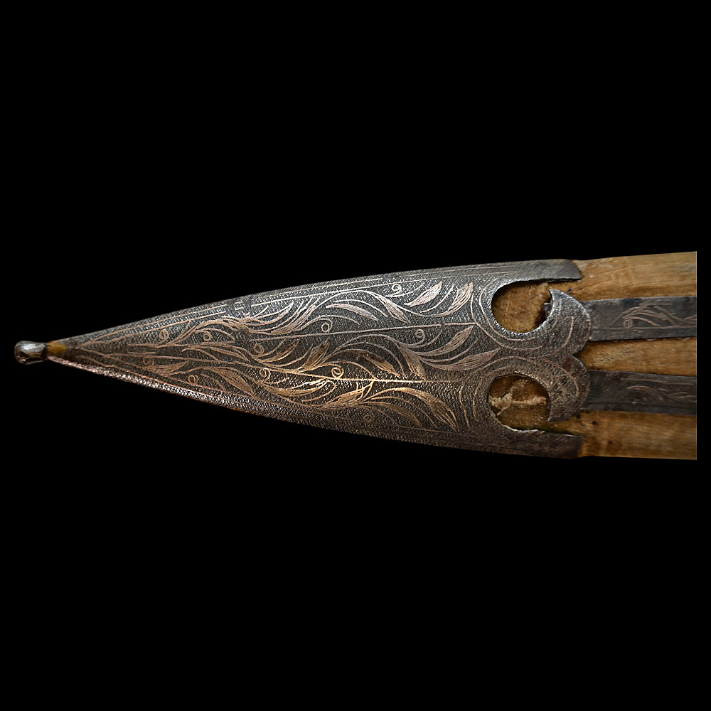 Very Rare Muslim Zulfiqar-Style Dagger with Silver Kofgari Inscriptions, Ottoman Empire, Syria, 19th Century. A highly unusual and collectible 19th-century Muslim dagger inspired by the legendary Zulfiqar sword, characterized by its distinctive bifurcated blade. This Syrian piece features a robust double-edged blade elegantly divided into two points, richly decorated with silver kofgari inlay depicting intricate floral motifs and religious inscriptions in Arabic script. The scabbard is of velvet-covered wood with silver-decorated fittings, echoing the blade’s ornamental design. Such daggers served as ceremonial or devotional objects—often representing divine justice and spiritual strength in Muslim tradition. A quality piece, exceedingly rare on the market, combining historical reverence with craftsmanship. Good condition. Size 29 cm.
