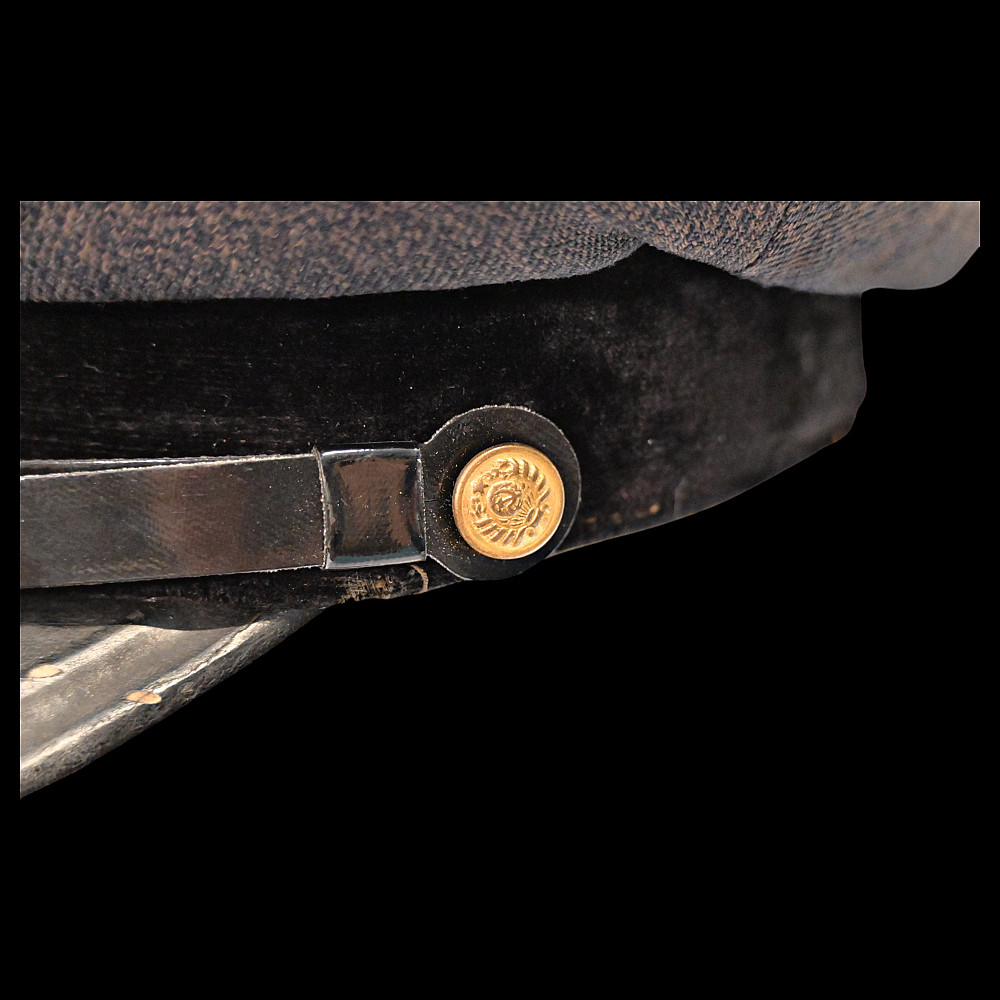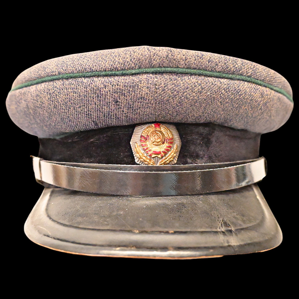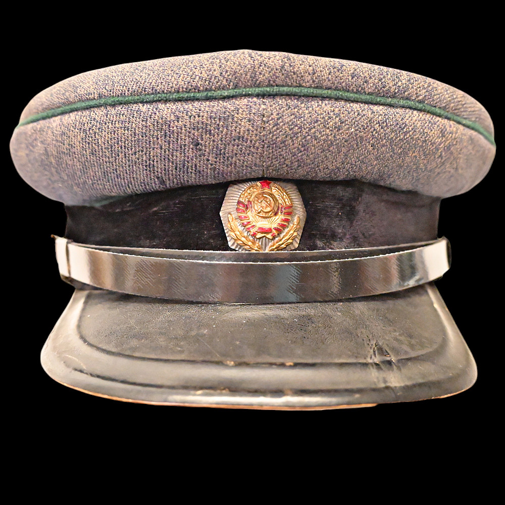 Very Rare Soviet Prosecutor's Visor Cap, 1940s. An exceptional and historically significant visor cap of a Soviet Union prosecutor from the 1940s. The cap features the distinctive gray wool crown with green piping and a black velvet band, complete with the iconic red and gold enameled Soviet emblem on the front. The visor is made of lacquered leather, accompanied by a chinstrap affixed with two gold-tone buttons featuring the Coat of Arms of the Soviet Union. Inside, the cap bears a partially legible maker’s mark and the size number “57.” The condition is consistent with age and showing signs of honest wear. A rare and authentic piece from the Stalin-era legal system, offering deep historical value and collector appeal. Good condition. Size cm.
