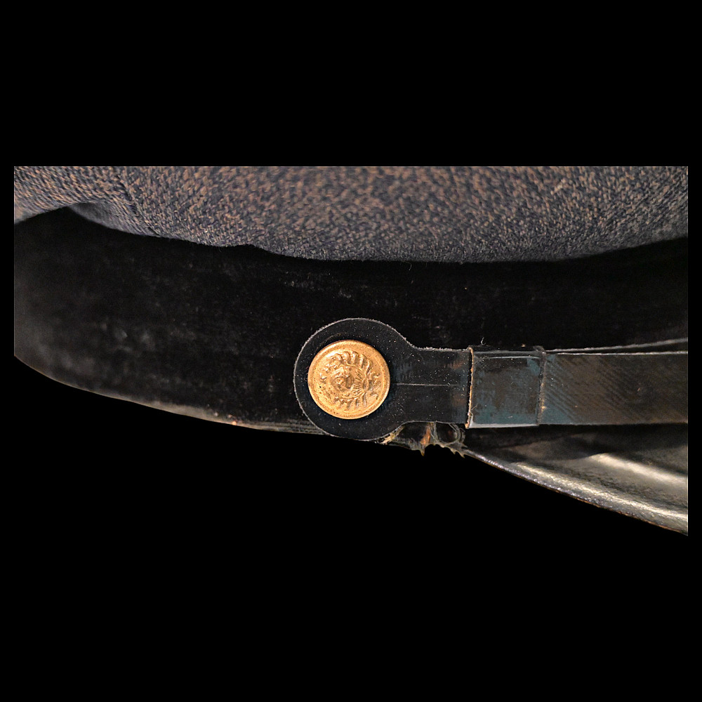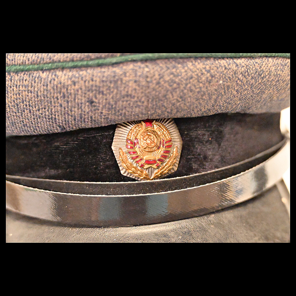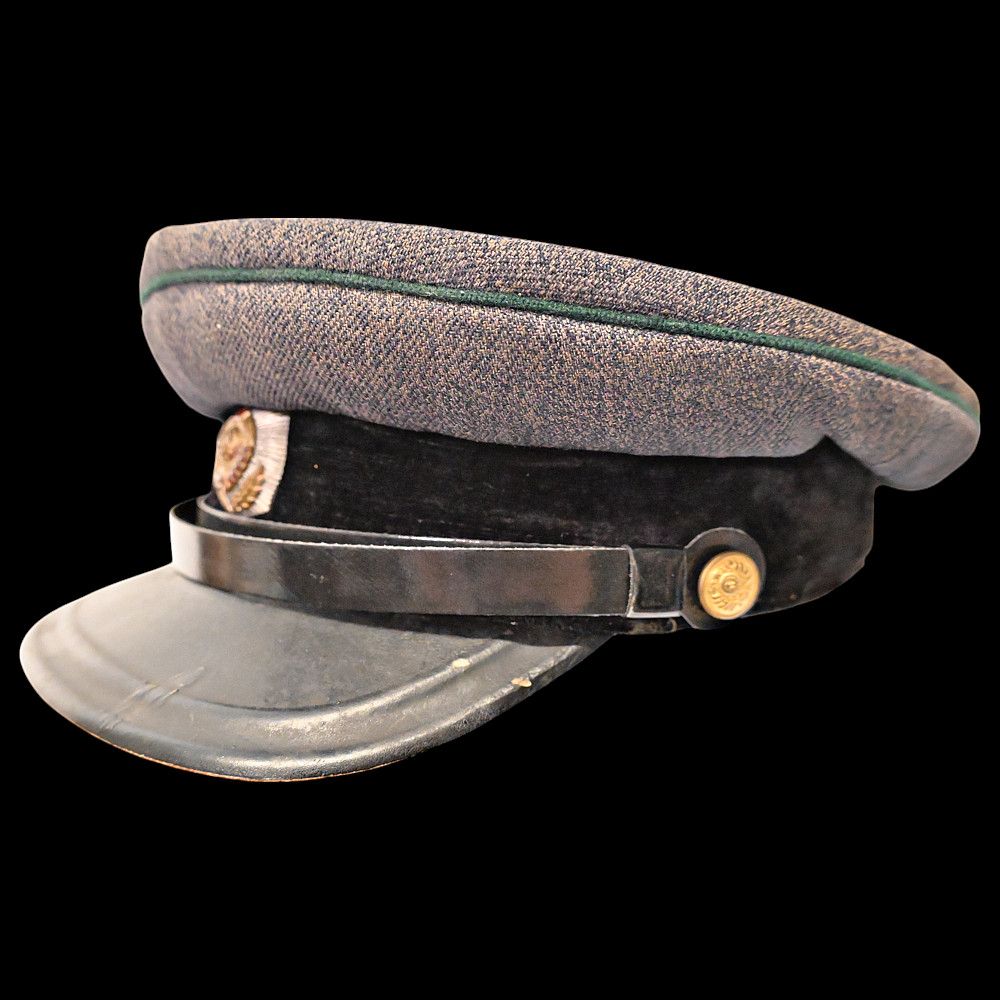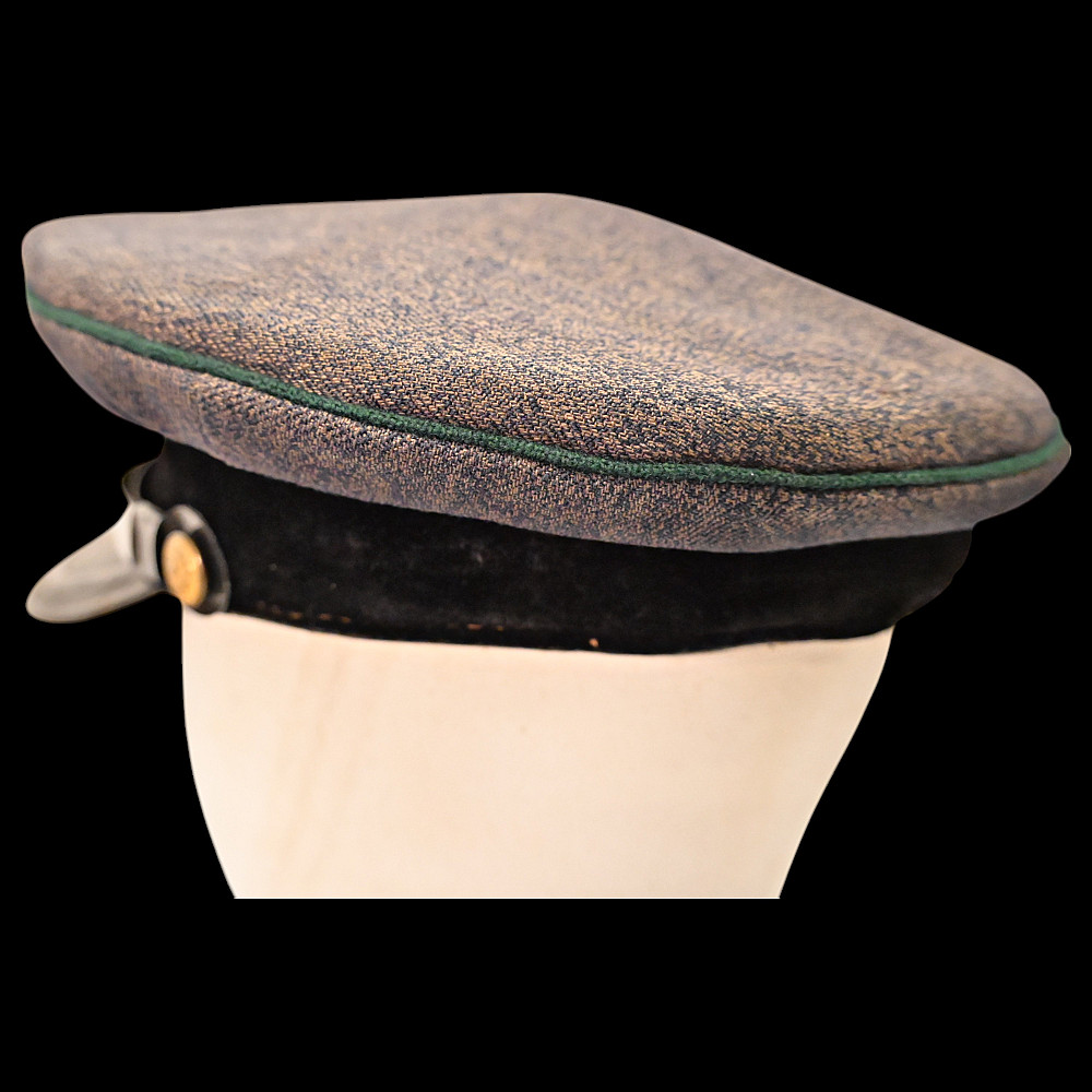 Very Rare Soviet Prosecutor's Visor Cap, 1940s. An exceptional and historically significant visor cap of a Soviet Union prosecutor from the 1940s. The cap features the distinctive gray wool crown with green piping and a black velvet band, complete with the iconic red and gold enameled Soviet emblem on the front. The visor is made of lacquered leather, accompanied by a chinstrap affixed with two gold-tone buttons featuring the Coat of Arms of the Soviet Union. Inside, the cap bears a partially legible maker’s mark and the size number “57.” The condition is consistent with age and showing signs of honest wear. A rare and authentic piece from the Stalin-era legal system, offering deep historical value and collector appeal. Good condition. Size cm.