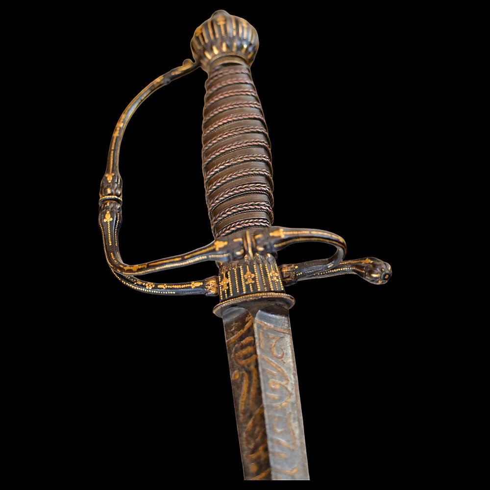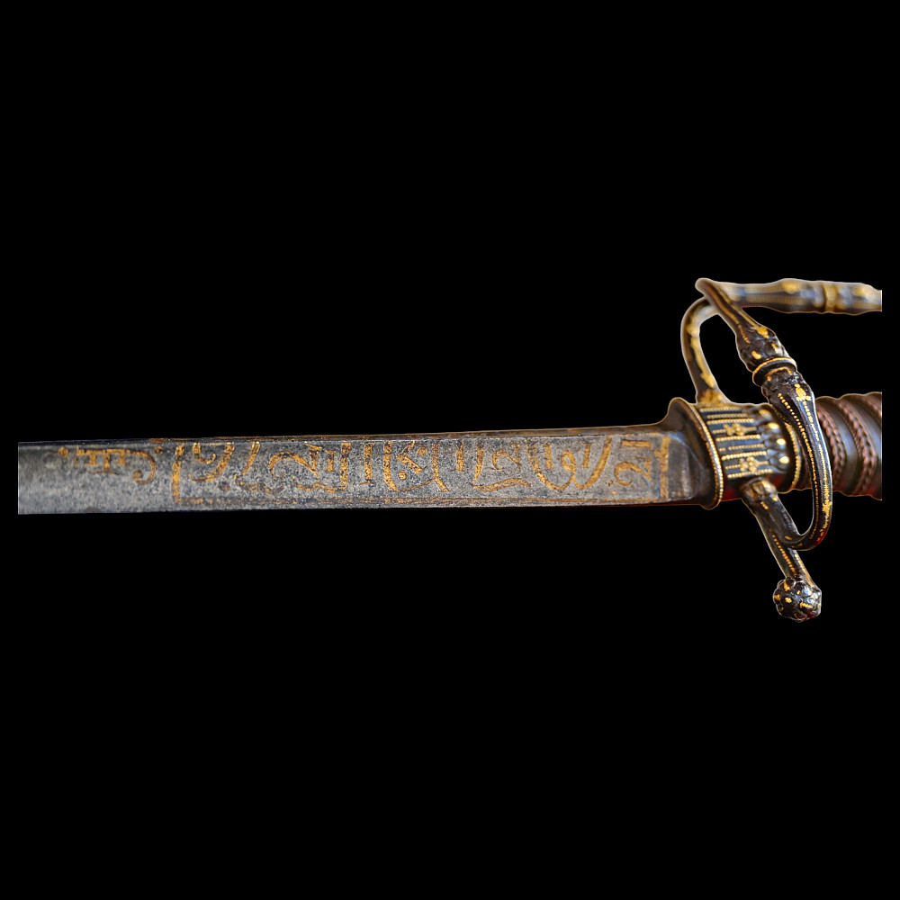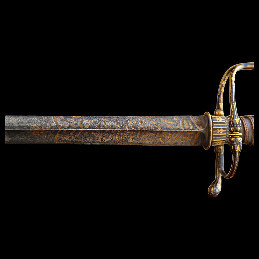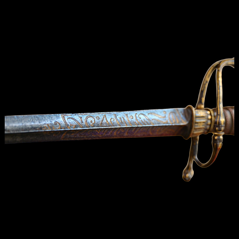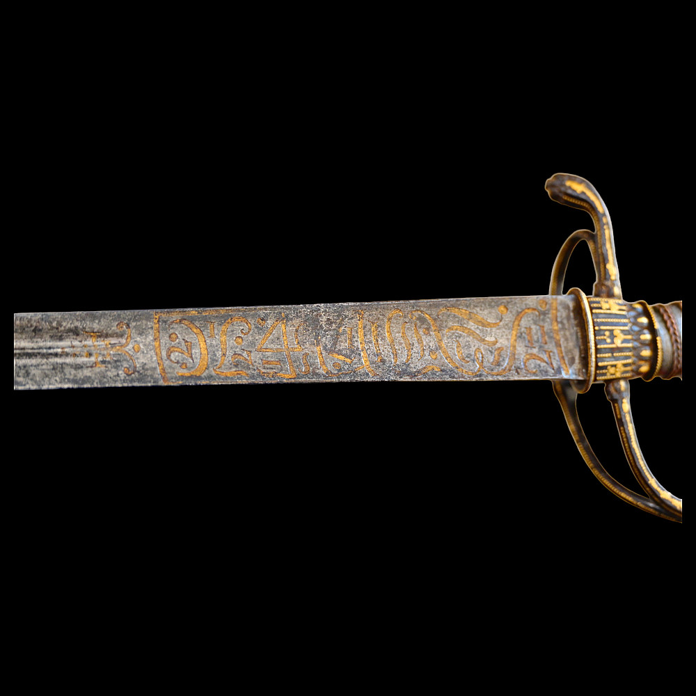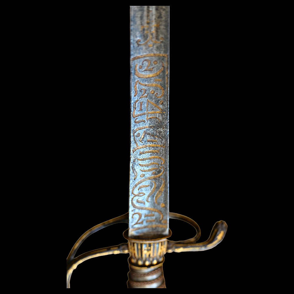 Very Rare sword, With Kabbalistic (magical) spells, Germany, second half of the 17th century. Straight, steel, triangular blade. Kabbalistic spells are engraved and gilded at the base of the blade. The steel hilt is inlaid with gold. The handle is made of wood, wrapped in a spiral with copper wire and tape. This is a rare example of a large Kabbalistic spell being used on a blade, and is a very interesting example for the study and translation of inscriptions by scientists and experts. A beautiful collectible sword in excellent condition. Length 86 cm.