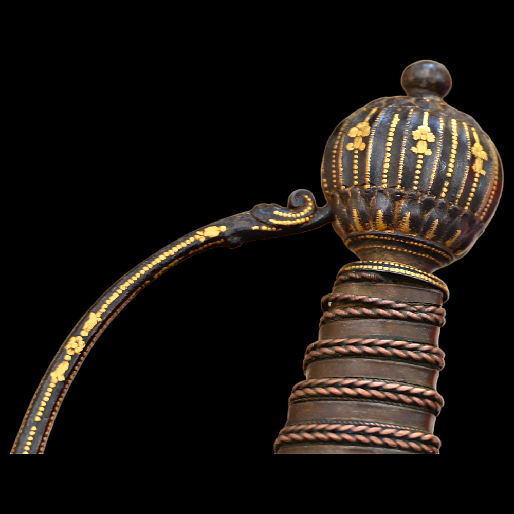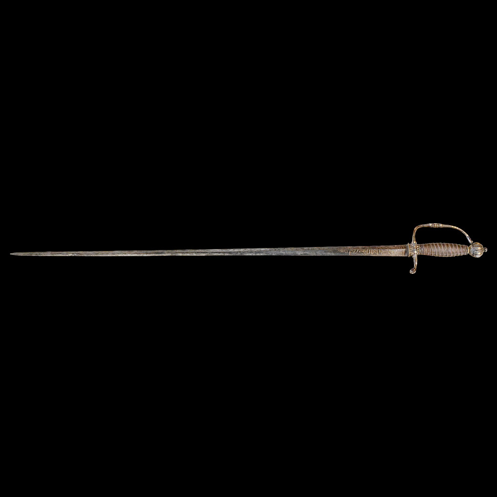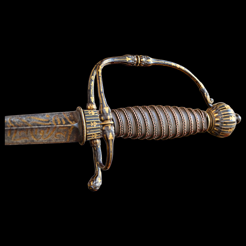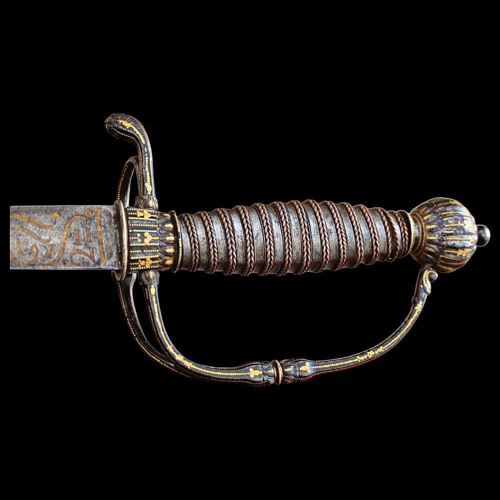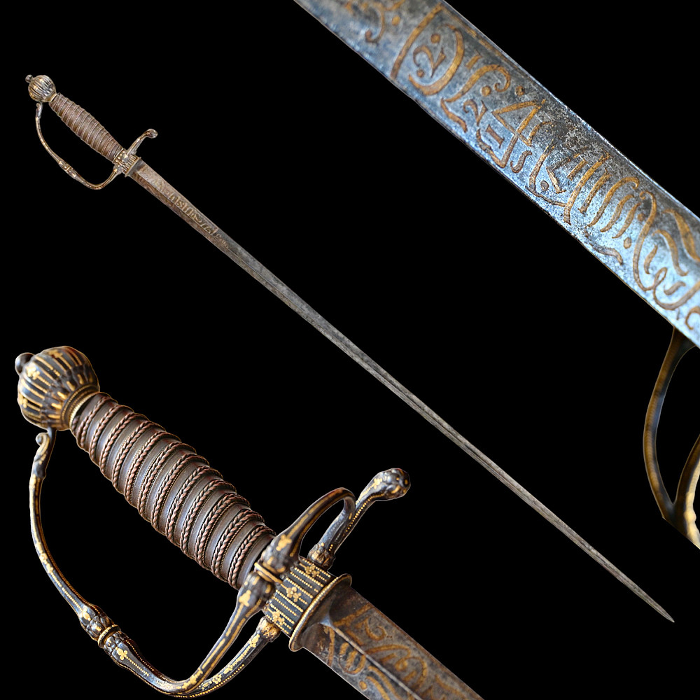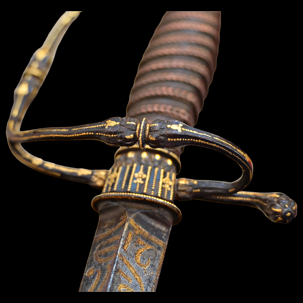 Very Rare sword, With Kabbalistic (magical) spells, Germany, second half of the 17th century. Straight, steel, triangular blade. Kabbalistic spells are engraved and gilded at the base of the blade. The steel hilt is inlaid with gold. The handle is made of wood, wrapped in a spiral with copper wire and tape. This is a rare example of a large Kabbalistic spell being used on a blade, and is a very interesting example for the study and translation of inscriptions by scientists and experts. A beautiful collectible sword in excellent condition. Length 86 cm.