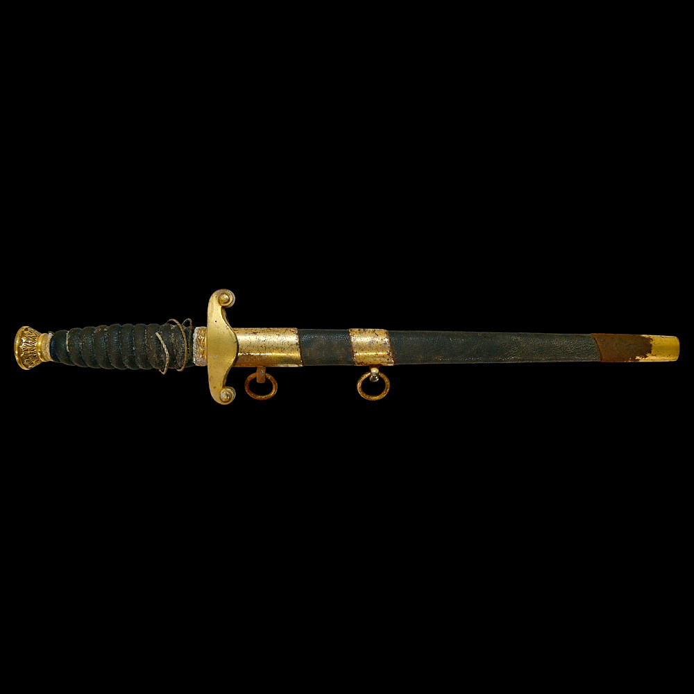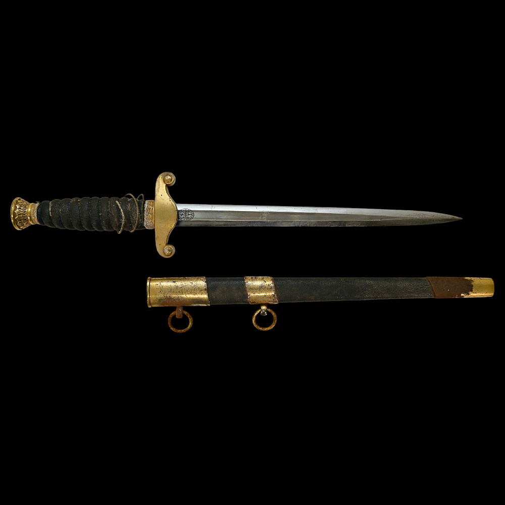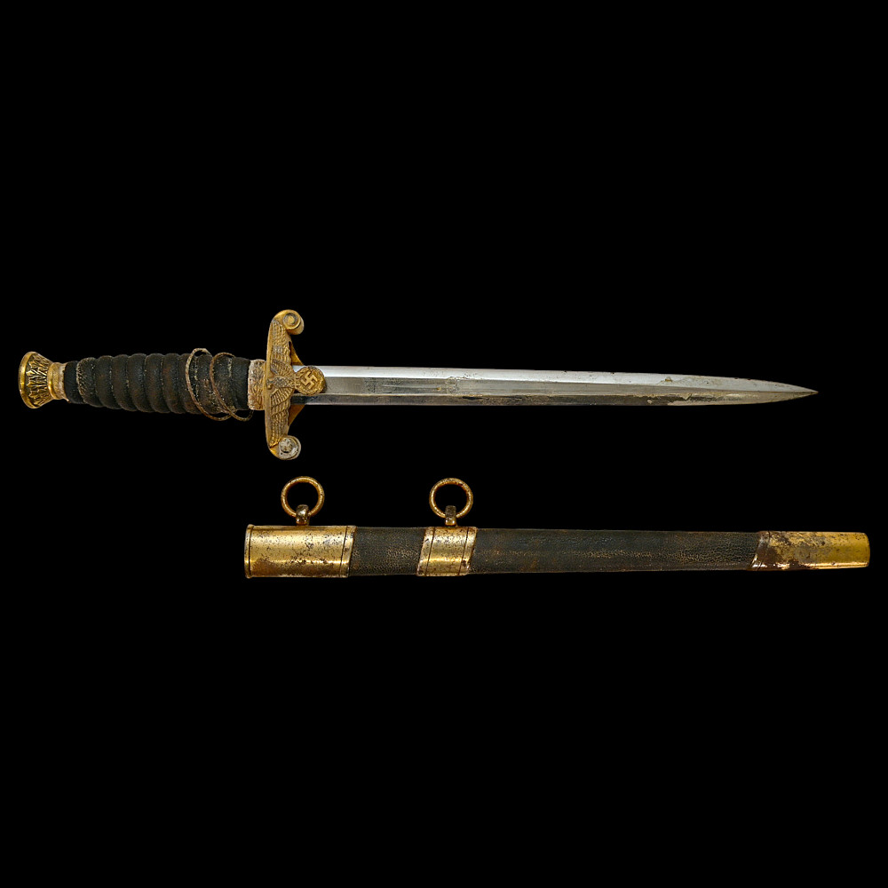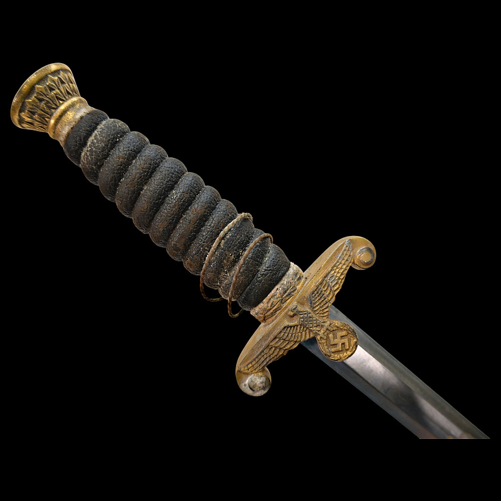 Water Customs Official’s Dagger, Germany, Third Reich, E & F Horster, Solingen. German Water Customs Service Officer's dagger (Wasserschutz-Zollbeamterdolch), complete with its scabbard. This model was issued exclusively to officers of the Water Customs branch of the Reichsfinanzverwaltung, responsible for border and maritime customs enforcement. The double-edged blade, finely etched and well-preserved, bears the maker’s mark of E. & F. Hörster, Solingen. The gilt brass hilt features the national eagle and wreath emblem, while the grip is covered in leather wrapped with twisted wire, and finished with pommel. The leather scabbard retains all gilt brass fittings and suspension rings. A highly desirable and rarely encountered official Water Customs dagger, representing one of the most distinctive and elegant edged weapons of the period. Good condition, the wire on the handle is damaged. Authenticity not guaranteed. Length: approx. 41.5 cm.