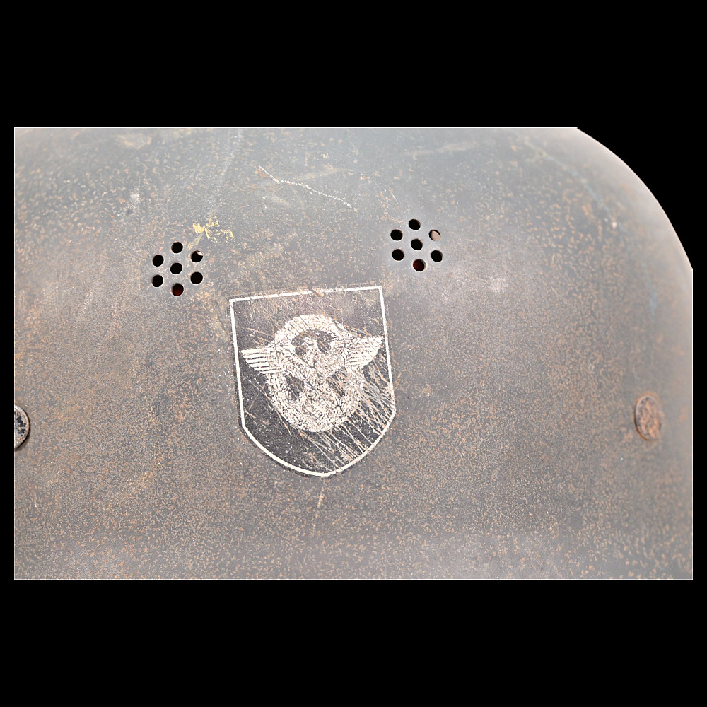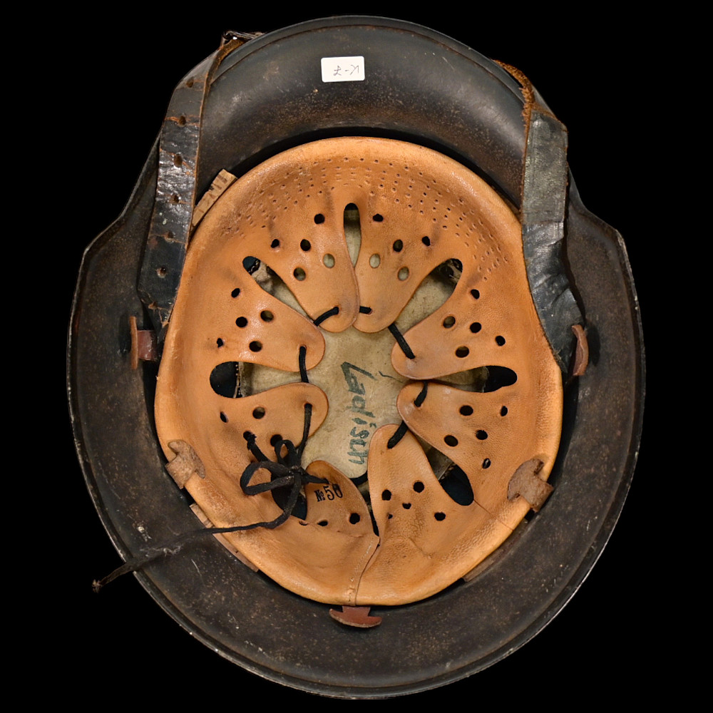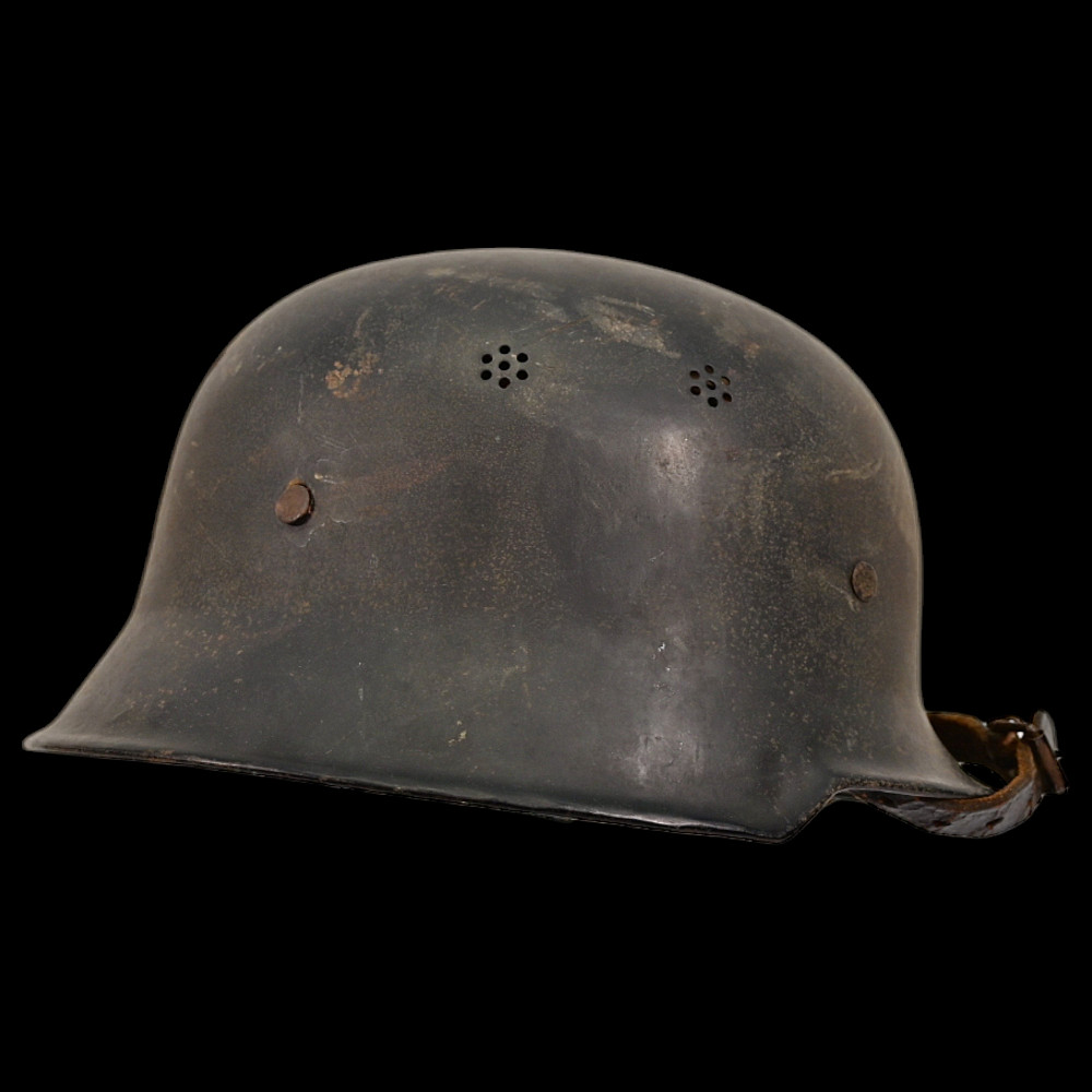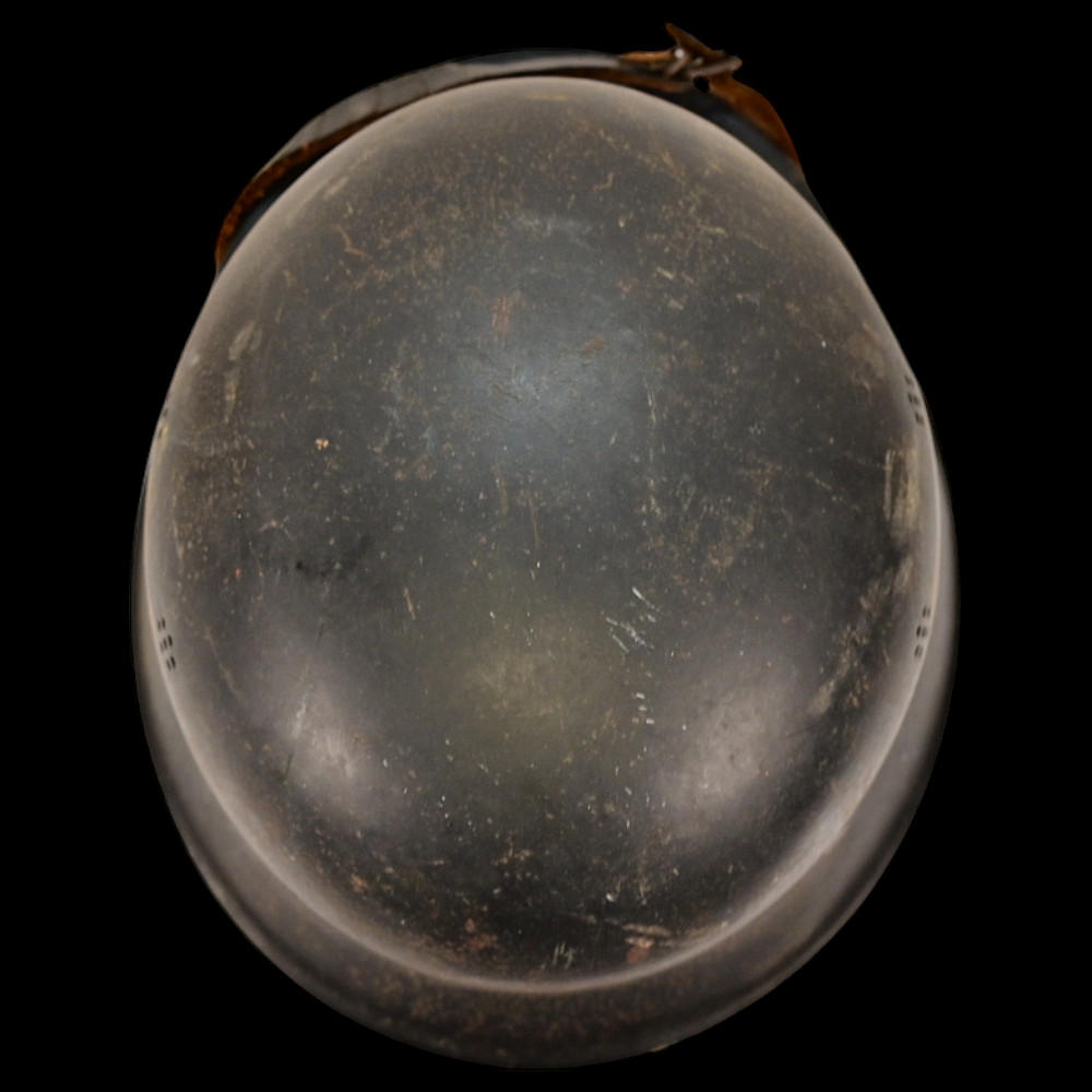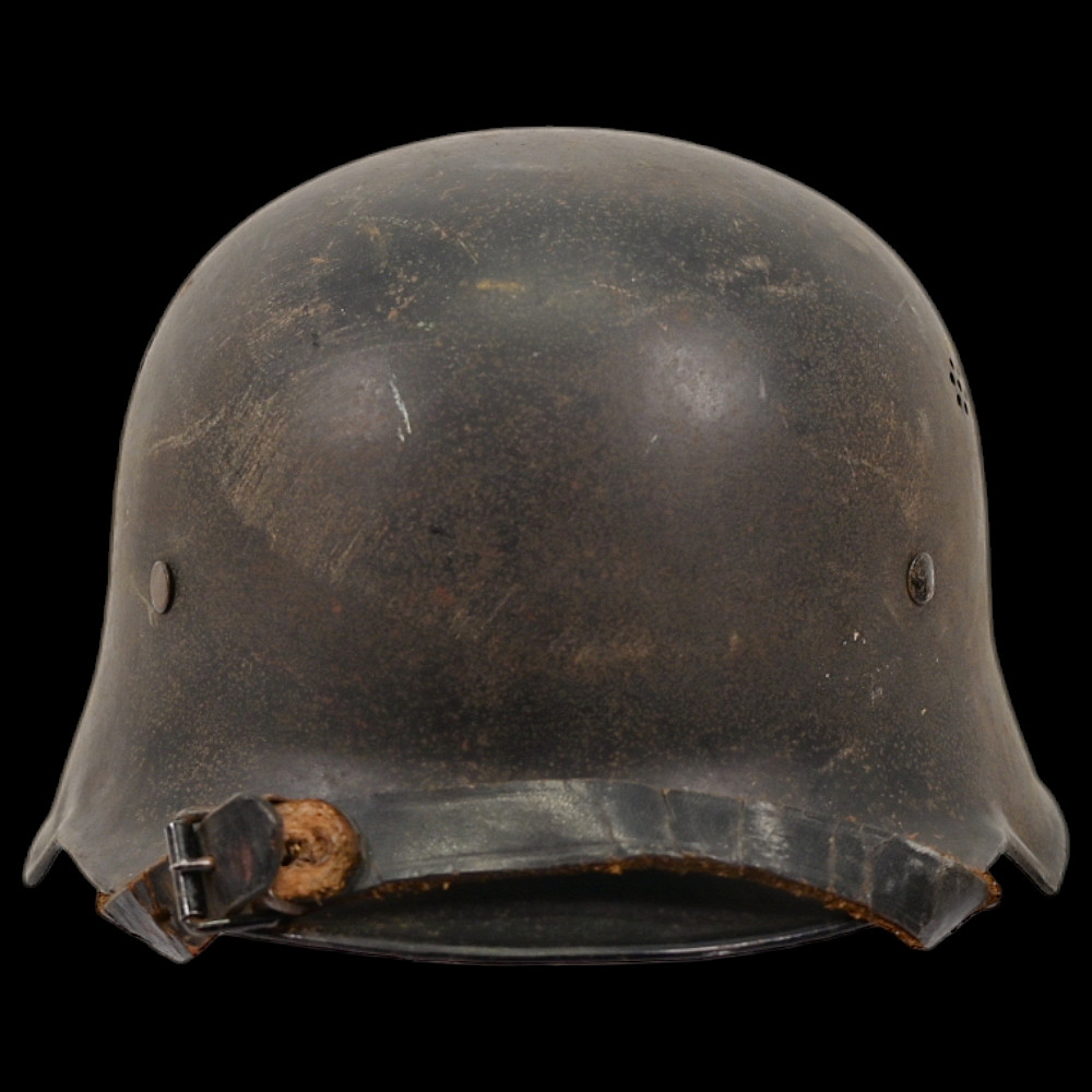 WWII Nazi German Fireman M34 Helmet, FEUERSCHUTZPOLIZEI HELMET. This helmet retains its original liner and chinstrap, enhancing its authenticity as a well-preserved relic. A stamp with the number 56 is present on the lining, along with what appears to be the owner's name. The overall condition of the helmet suggests it has been well-maintained, offering a great example for collectors of WWII memorabilia. The photo shown is for reference and not part of the included set. Good condition
