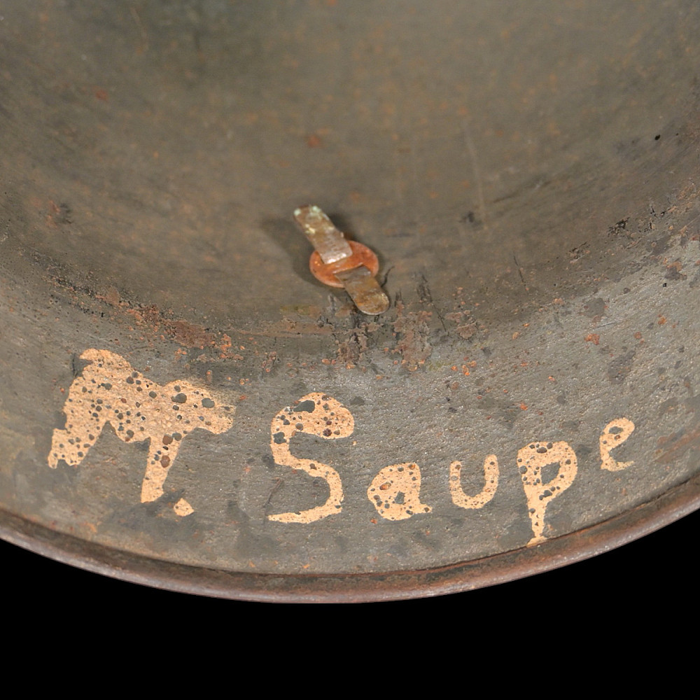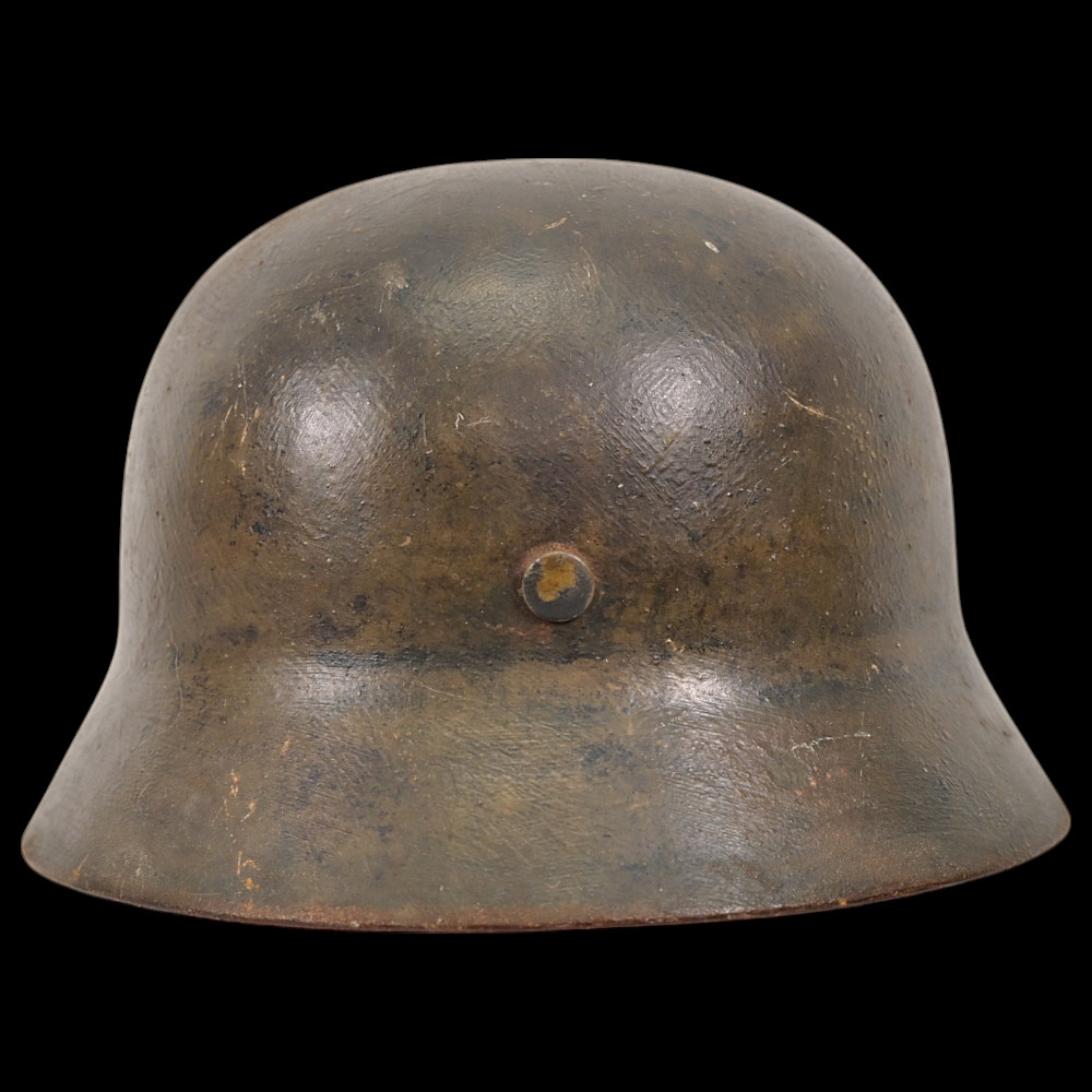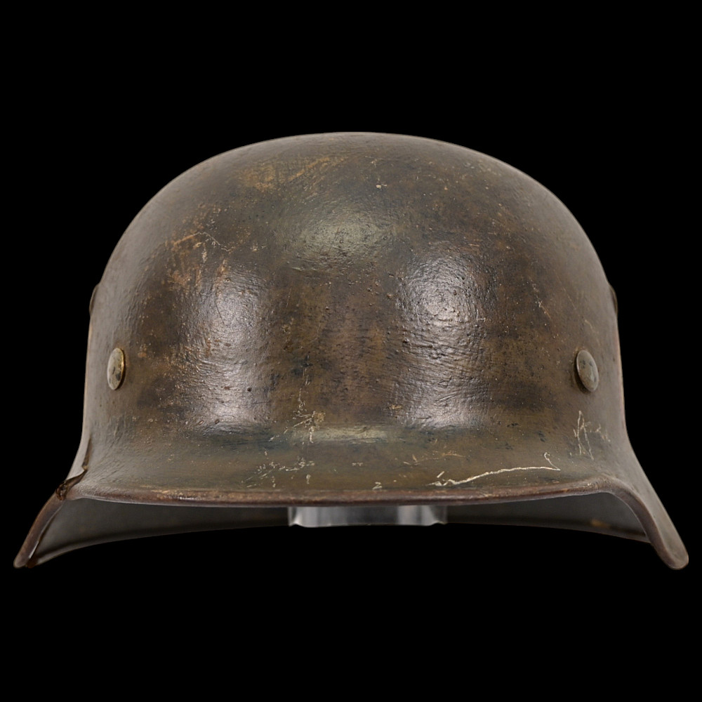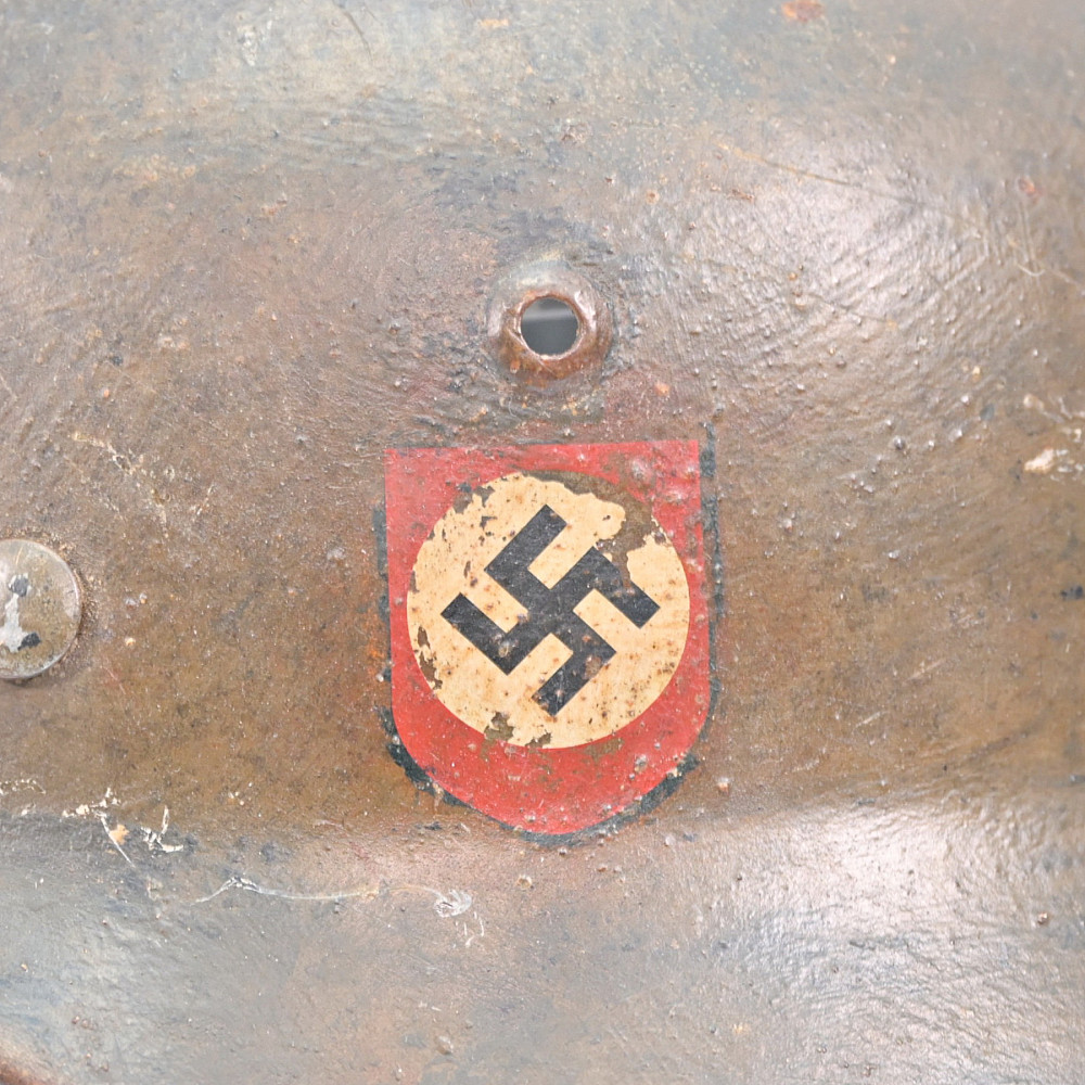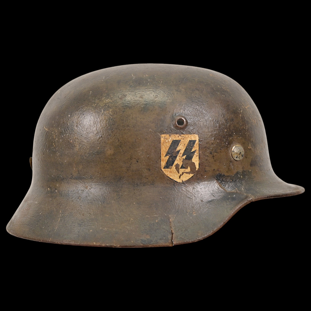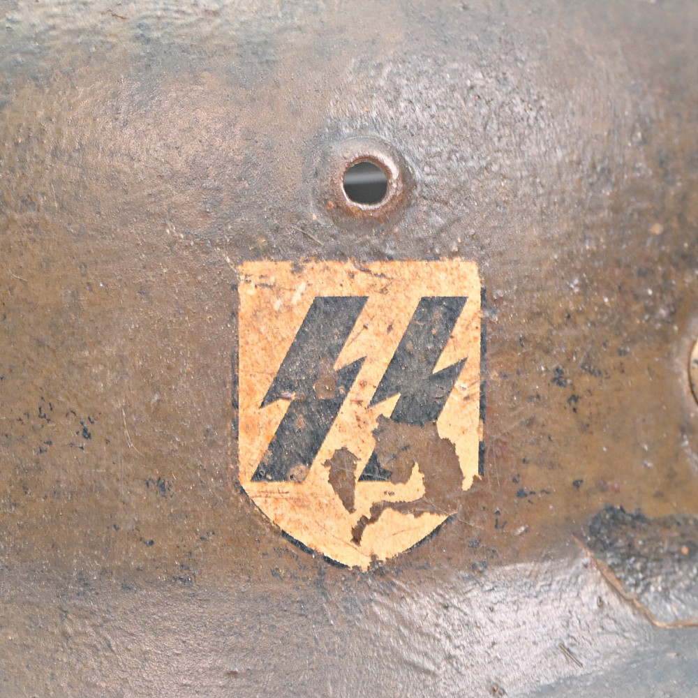 WWII Nazi German M40 SS Combat Helmet with SS emblems on the sides. The helmet shows signs of wear. This helmet is a significant piece of WWII militaria, representing the Waffen-SS forces. It is an excellent example of original combat gear, adding historical value for collectors. Damage on the right side, see photos.
