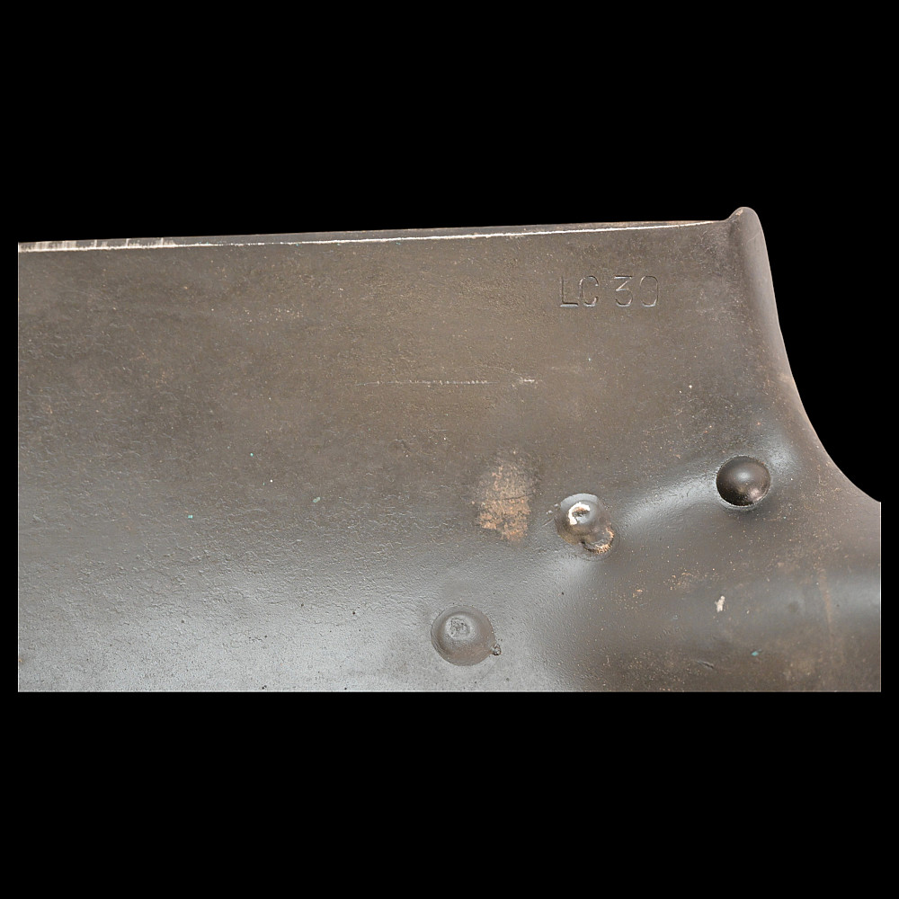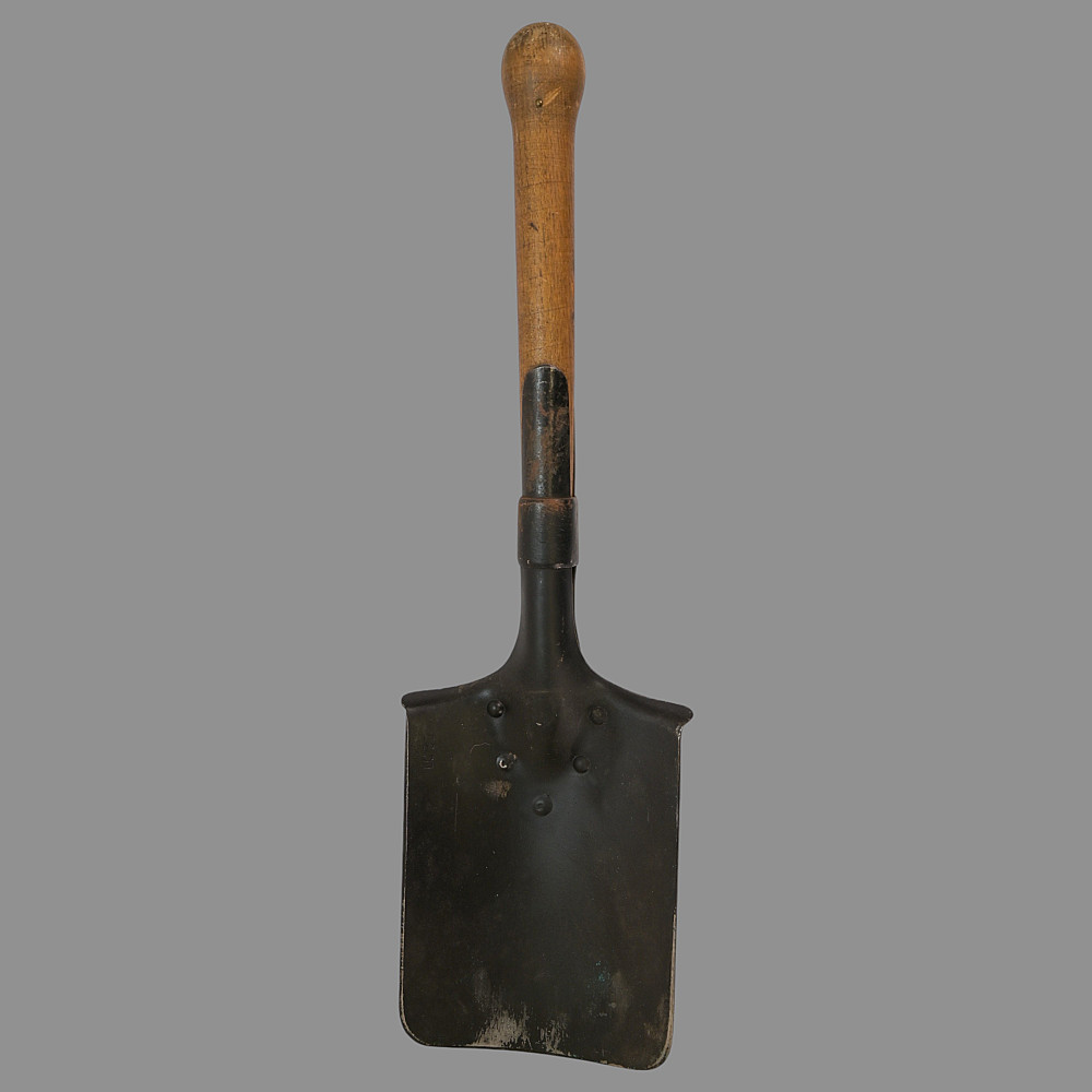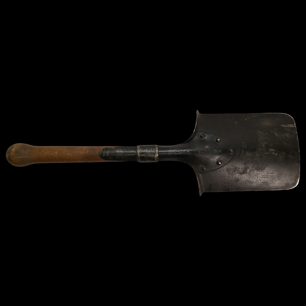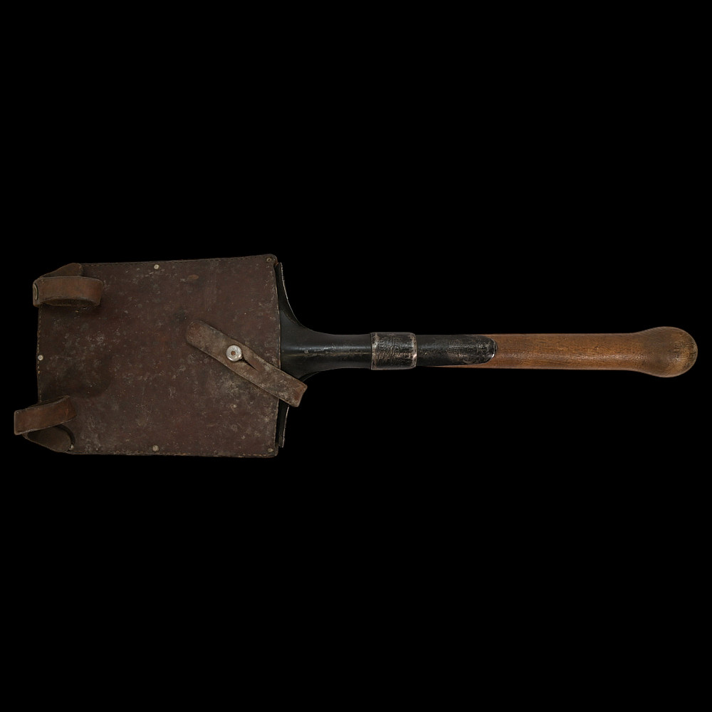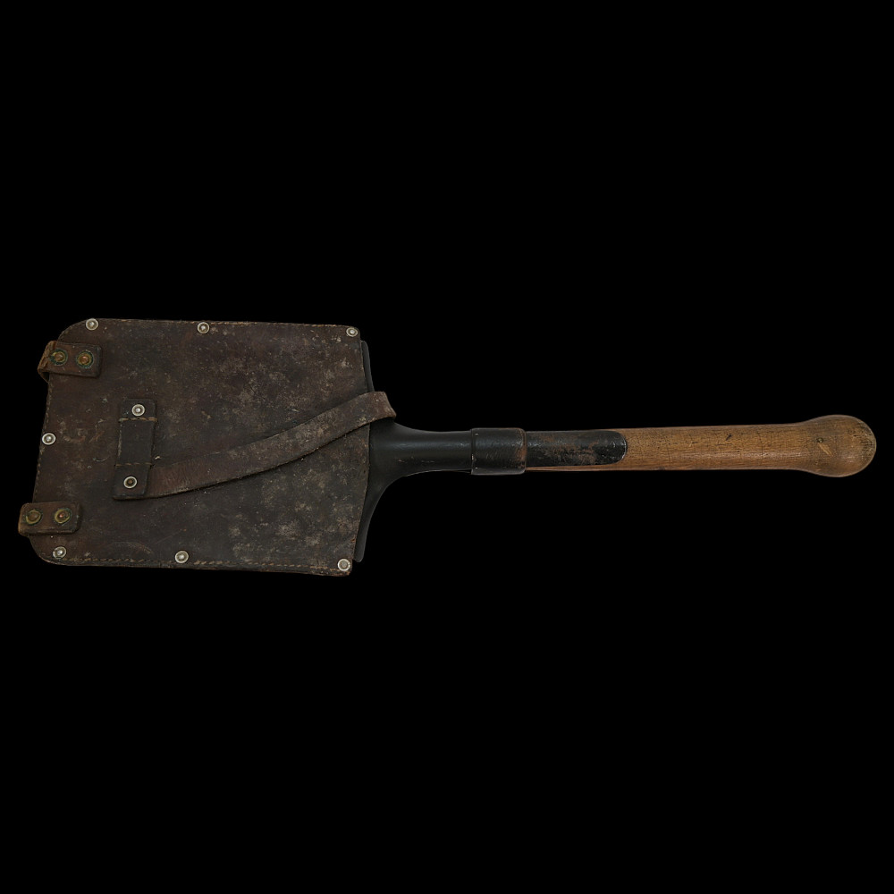 WWII Nazi German Shovel Entrenching Tool marked LC30 and leather cower. The rectangular blade mounted on a short wooden handle with a round thickening at the end. The upper sharp edges are bent on the back side, forming sharp protrusions. The handle is not painted. The tool is equipped with a square leather cover.Good condition. Length 57 cm.