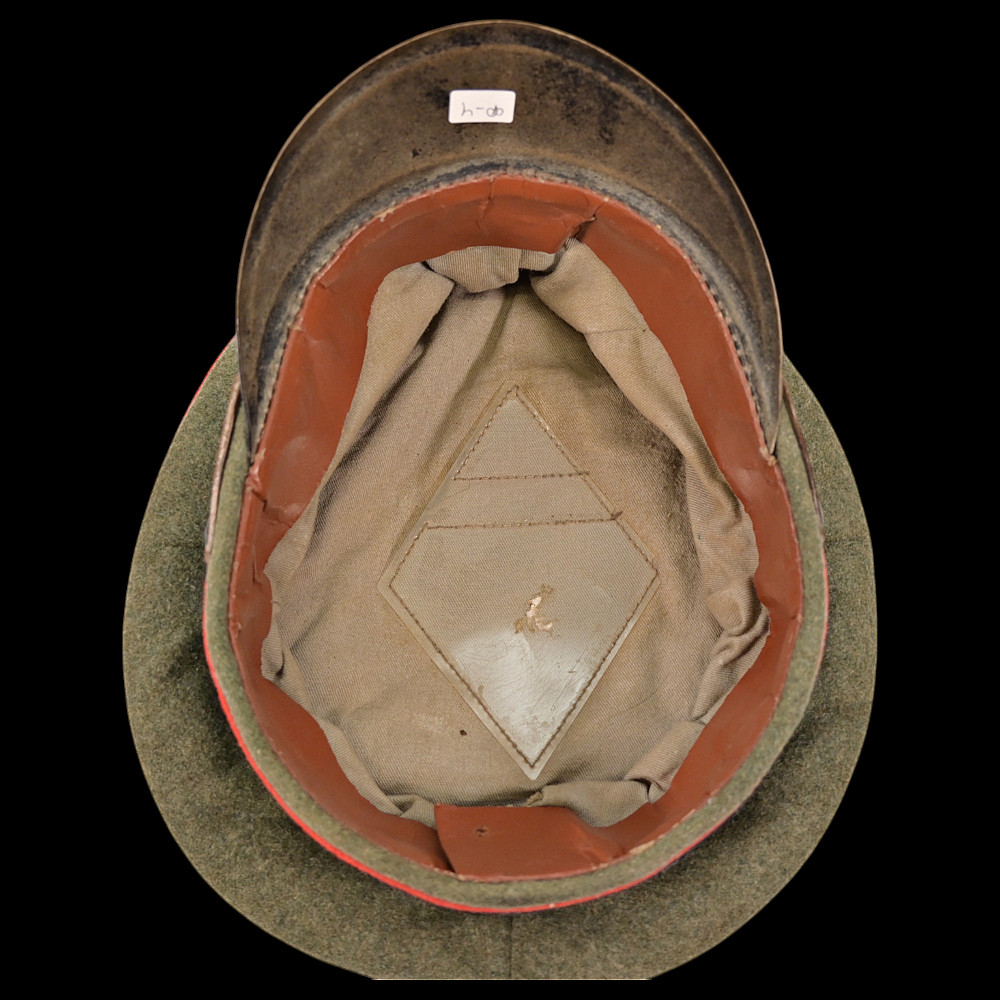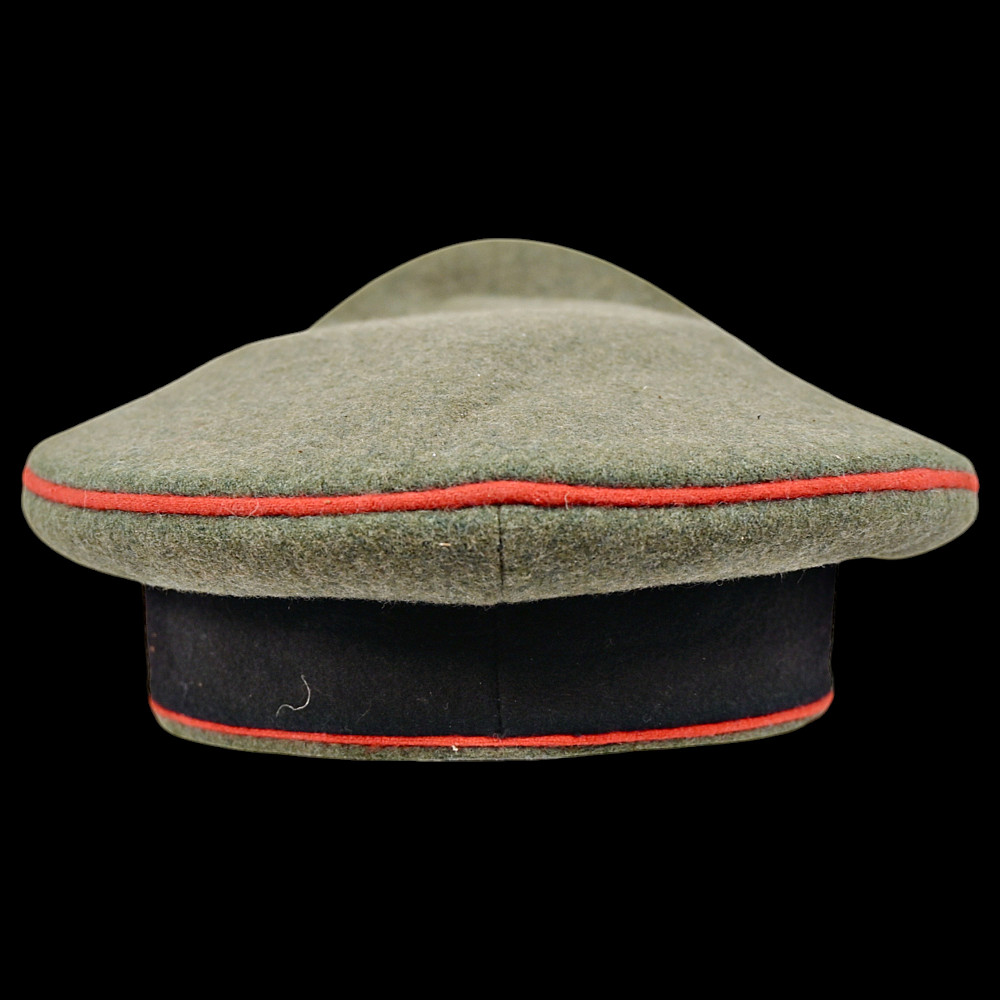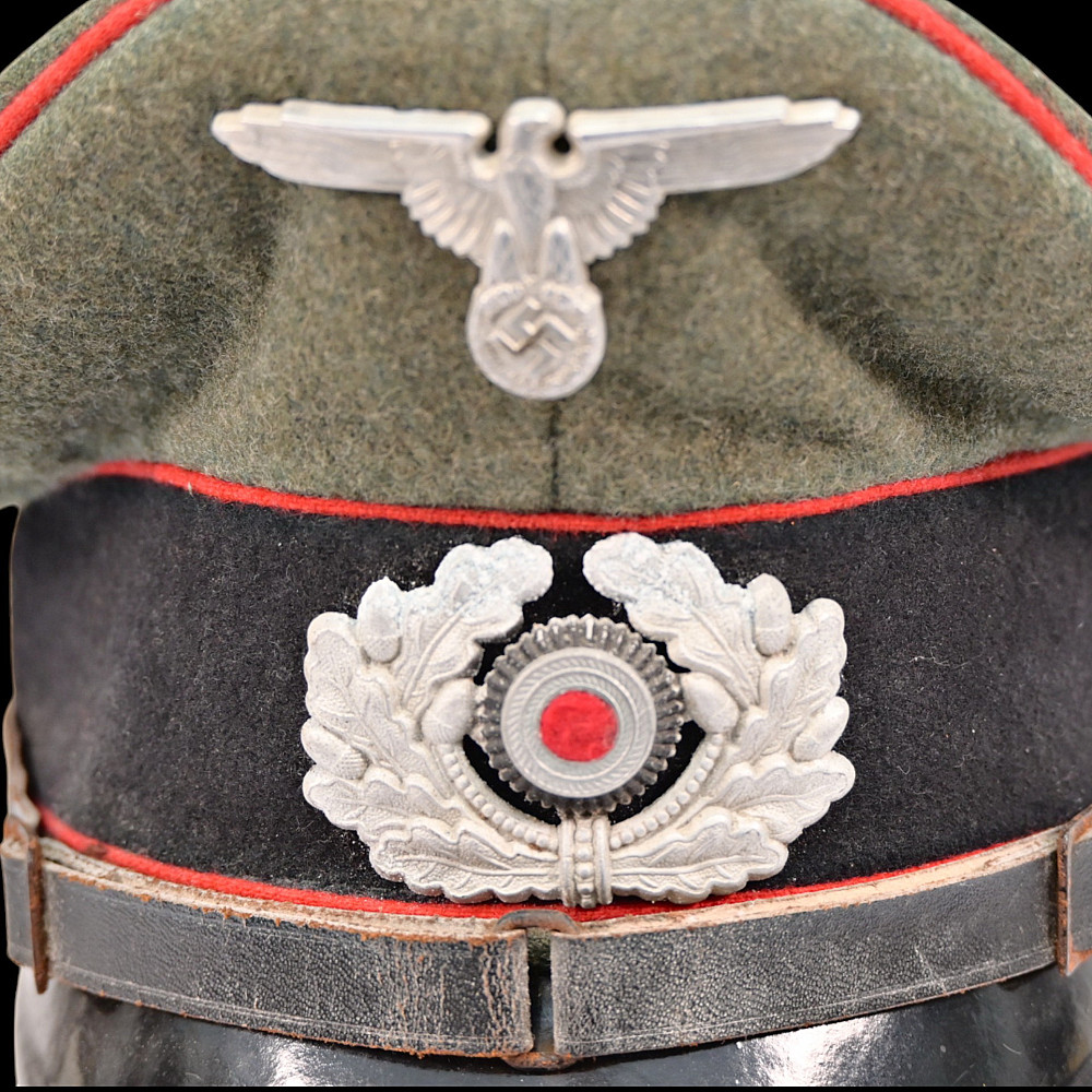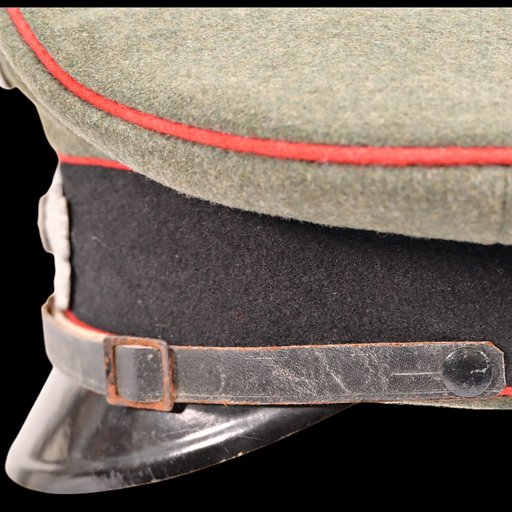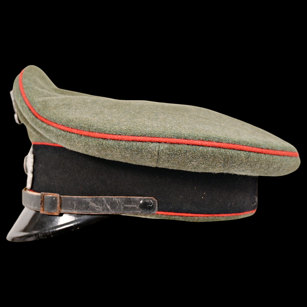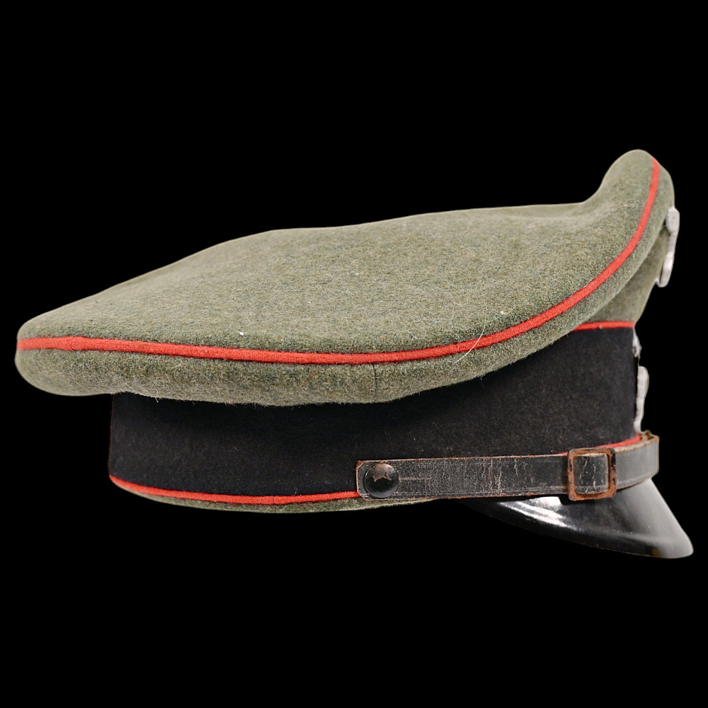 WWII Nazi German Waffen-SS Artillery Non-Commissioned Officer's Visor Cap, featuring a classic black design with red piping, indicative of artillery divisions. This cap has undergone a minor alteration, with the original cockade being replaced by the Wehrmacht cockade. Despite the modification, it retains its historical significance and authenticity, making it a valuable collectible. Good condition